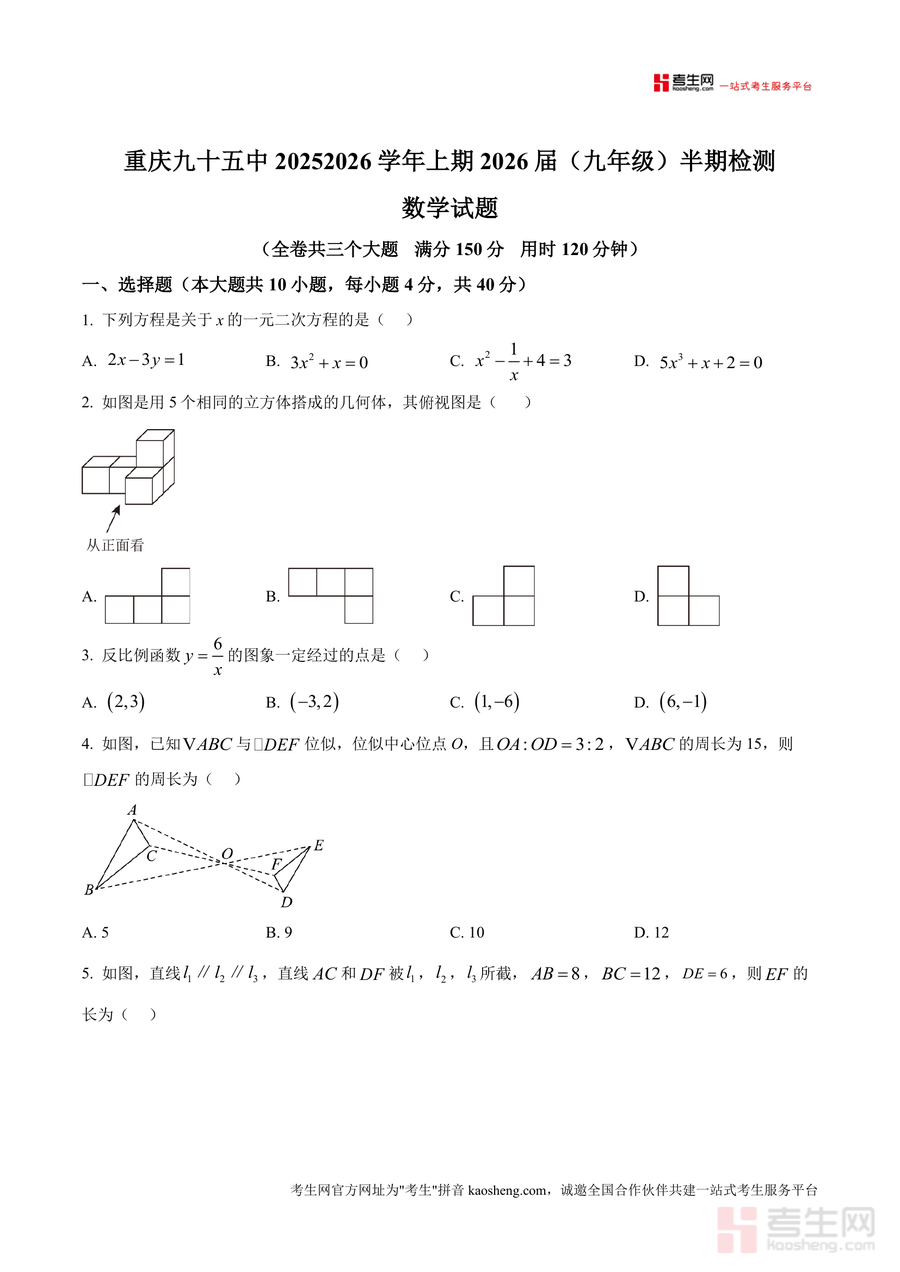 《精品解析:重庆市第九十五初级中学校2025--2026学年上学期九年级期中数学试题(原卷版).docx》是一份针对重庆九十五中九年级学生期中复习设计的专业备考资料,精准匹配该校期中数学考试题型结构与知识范围,涵盖选择题、填空题、解答题三大核心题型,包含一元二次方程、反比例函数、几何图形位似与折叠等关键知识模块;其特色在于以原卷形式完整呈现考试真实题量(25道题)与分值分布(全卷150分、120分钟用时),贴合校考命题规律。