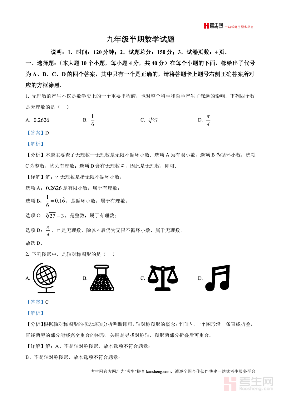 《精品解析:重庆市第十八中学2025--2026学年九年级上学期数学半期考试试卷(解析版).docx》是一份针对九年级上学期数学半期考试设计的精准备考资料与真题解析文件。文件包含符合150分分值、120分钟时长规范完整考试原题及对应详细解析,覆盖选择题(10小题)、填空题(6小题)等核心题型,解析部分结合无理数判定、轴对称图形识别、统计调查方式选择等考点,通过"考点分析+步骤详解"双模块呈现,既点明考查方向又提供清晰解题路径,是兼具权威性与实用性的校考真题资源。