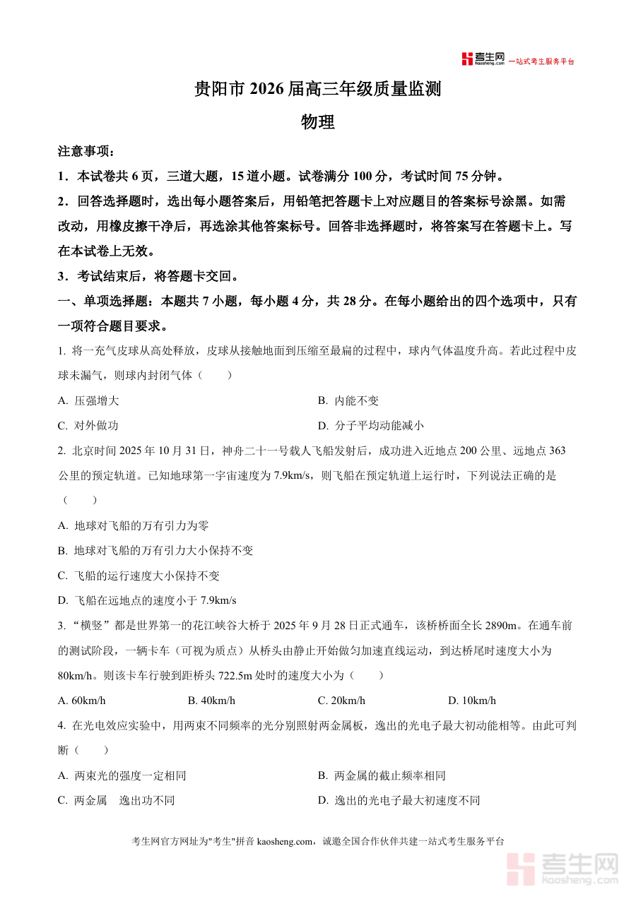 《精品解析:2026届贵州省贵阳市高三上学期质量监测物理试题(原卷版)》是一份针对贵州省贵阳市高三学生物理学科阶段性复习设计的高质量备考资料,包含完整原卷试题及对应解析内容。资料覆盖力学、电磁学等核心模块,题目设置贴合本地教学进度与考情,如单选择题涉及气体状态变化、万有引力定律应用,多项选择题涵盖电场电势、简谐横波等知识点,非选择题包含实验探究与综合计算题,全面考察学生对物理概念的理解与应用能力。其特色亮点在于解析部分针对每道题提供详细解题思路、公式推导及易错点提示,帮助学生深入掌握解题方法,同时标注题目对应知识点,便于学生构建知识网络,提升真题解析能力。