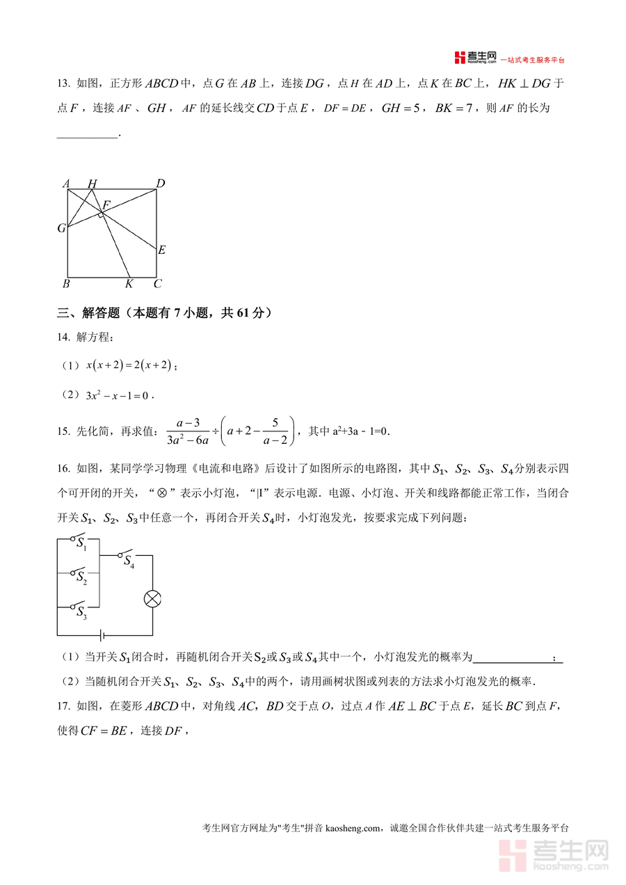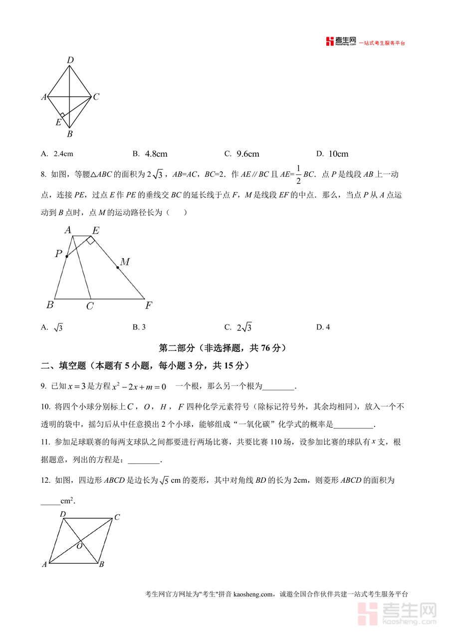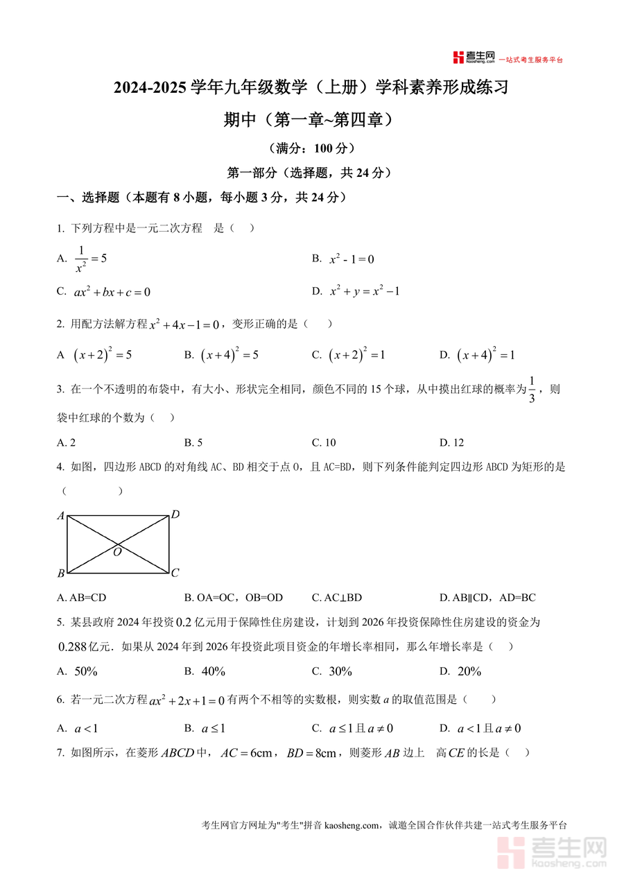 《精品解析:广东省深圳市龙岗区宏扬学校2024-2025学年九年级上学期11月期中数学试题(原卷版).docx》是一份针对深圳市龙岗区宏扬学校九年级上学期期中数学考查的真题原卷资料。其内容覆盖九年级上册第一章至第四章核心知识点,题型包含选择题、填空题及解答题三大类,全面涵盖一元二次方程求解、几何图形(菱形、矩形、正方形)性质应用、概率计算及实际应用问题等模块,精准贴合该校教学进度与期中命题方向,能真实反映该校期中考查重点与题型特点。