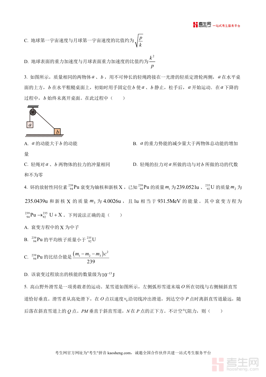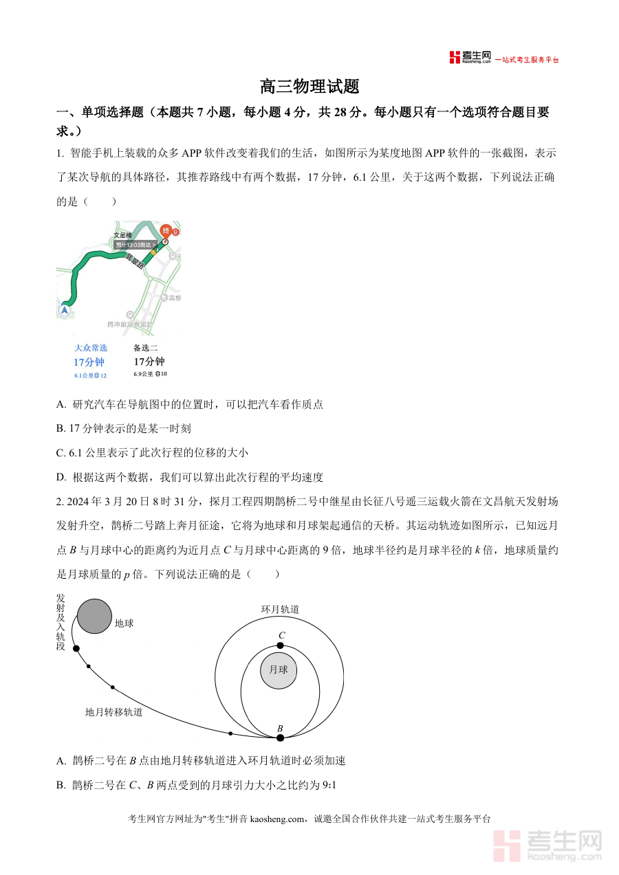 《精品解析:2026届陕西省西安市高新第一中学高三上学期四模物理试题(原卷版).docx》是一份面向高三物理备考阶段的高质量模拟试题资料,核心定位为助力学生巩固高考物理核心知识体系并提升应试能力,主要内容涵盖单项选择题(7小题)、多项选择题(3小题)及非选择题(5小题),涉及质点运动分析、天体物理规律应用、功能关系与能量守恒、核衰变与核能计算、斜抛运动与曲线运动、图像信息提取等高考物理重点模块;特色亮点在于依托西安高新一中优质教研资源,题型设置严格贴合陕西省高考物理命题趋势,注重对学生物理概念理解深度及规律综合应用能力考查,试题情境紧密联系生活实际(如智能手机导航、无人机运动)与前沿科技(如探月工程、硅基电池),增强试题的实践性与创新性。