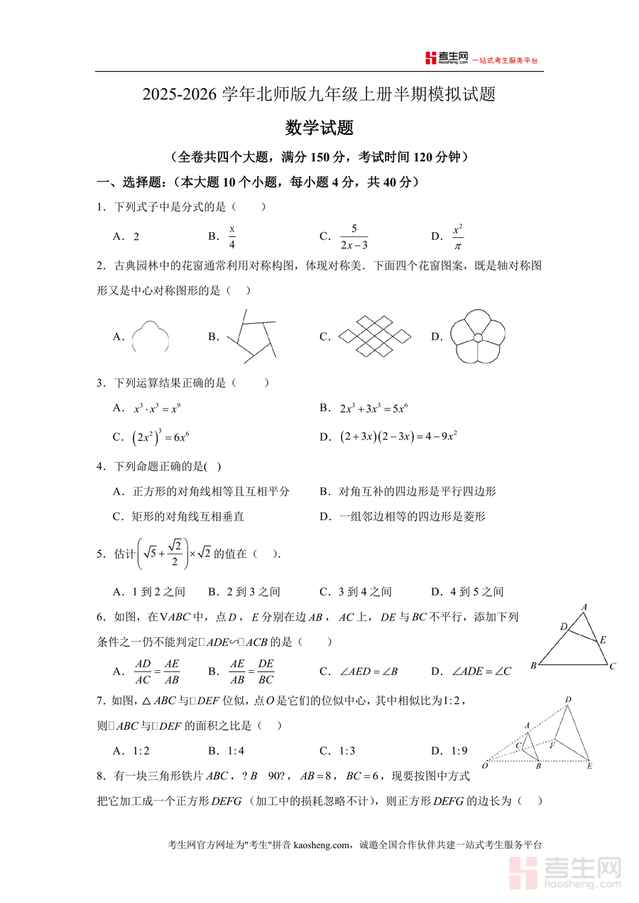 《2025-2026学年北师版九年级上册半期模拟试题(学生版).docx》是一份针对北师版九年级上册数学学科半期考试设计的专业备考资料,核心内容覆盖全卷四大题型(选择题10道40分、填空题6道24分、解答题多类共86分),考试时长120分钟满分150分,题型涵盖分式识别、对称图形判断、代数运算、几何相似与四边形证明、实际应用问题等核心知识点,特色亮点在于严格贴合北师版教材进度与半期教学重点分布,题目设计兼顾基础巩固与能力拓展,既有对核心概念的直接考查,也有对综合思维的深度训练。