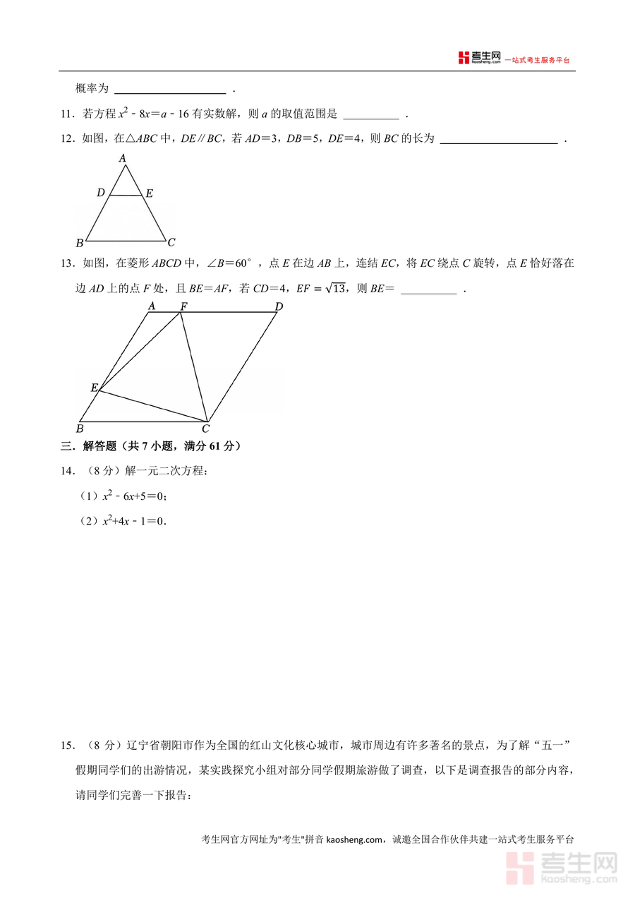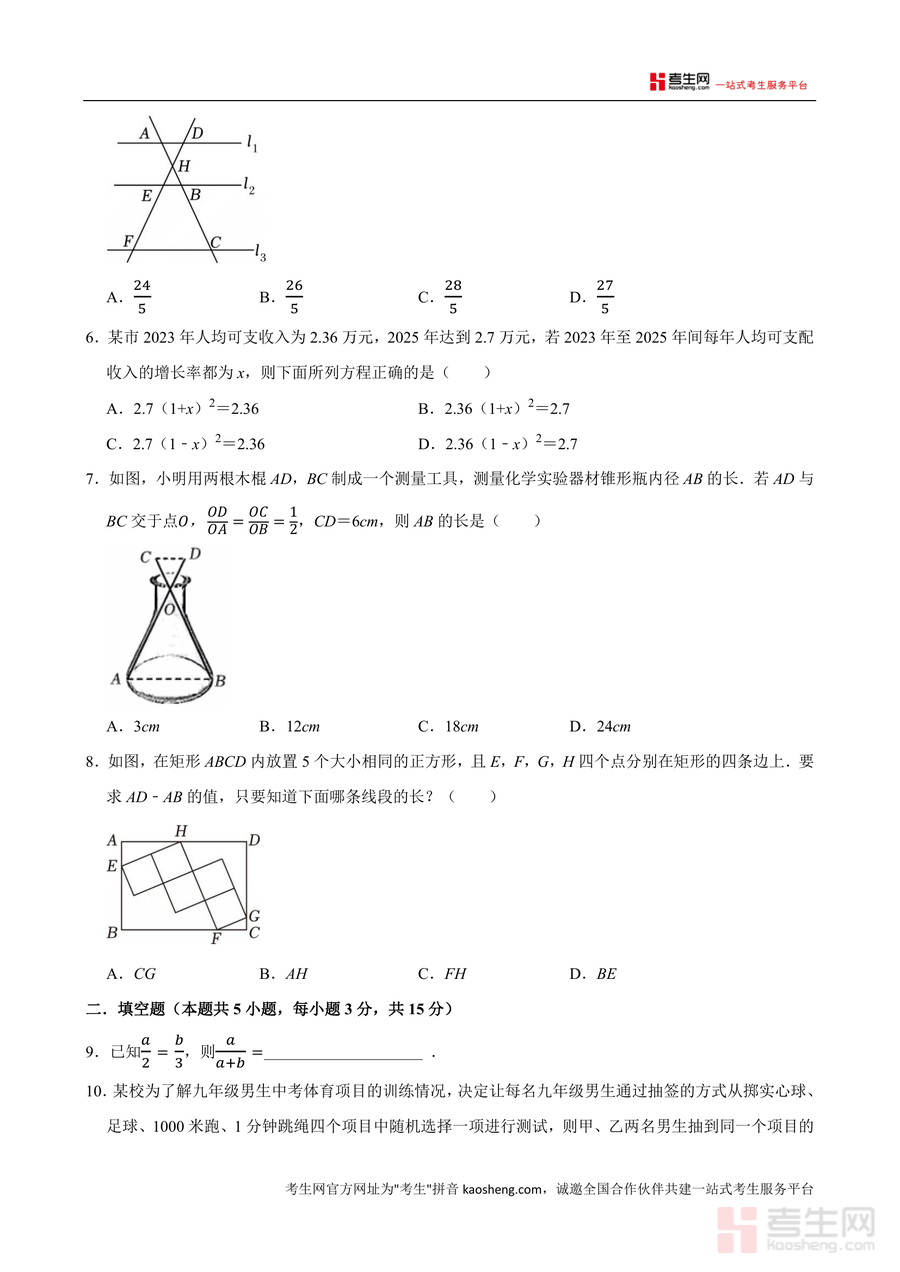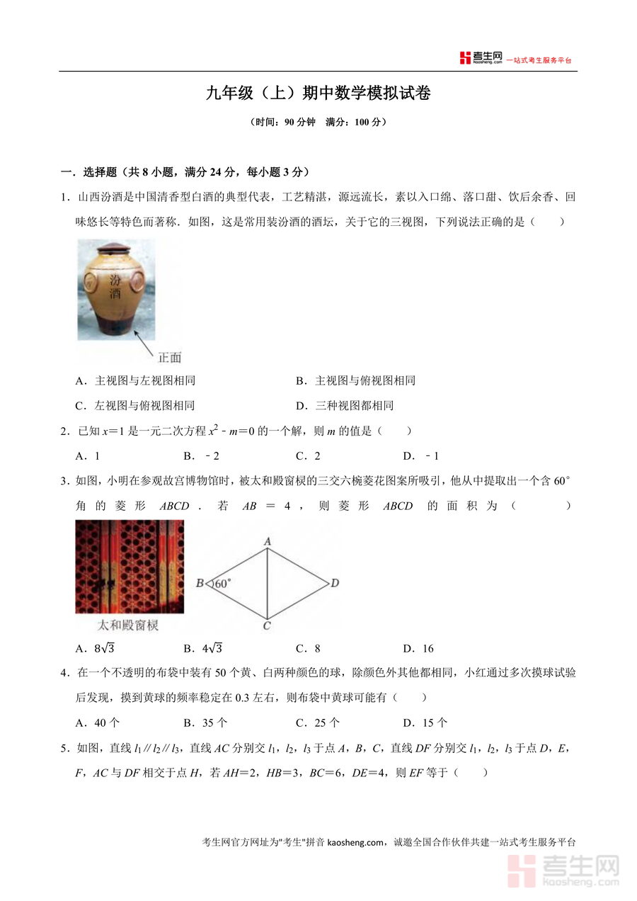 《广东省深圳外国语学校(集团)宝安学校2025-2026学年九年级上学期期中数学模拟试卷.docx》是一份针对九年级上学期期中数学备考的高质量模拟资料。该试卷严格遵循深圳中考数学命题趋势及深外宝安学校教学大纲要求编制,涵盖选择题(8小题)、填空题(5小题)、解答题(7小题)三大题型,内容覆盖三视图、一元二次方程、菱形性质、概率统计、相似三角形等核心考点,且融入生活实际案例(如汾酒坛三视图、童装销售问题)与几何模型(如"一线三等角"模型)等特色内容,兼具基础性与拓展性。
