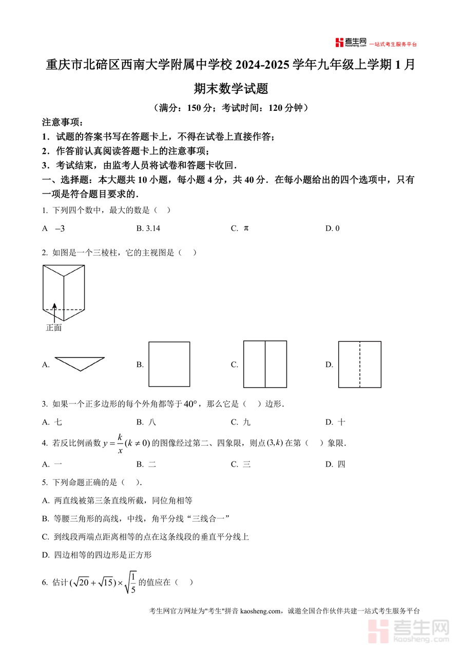 本资料适用于重庆市北碚区及周边地区九年级学生、初中数学教师及课外辅导人员。作为西南大学附属中学期末数学考试原卷,它具有不可替代参考价值,不仅能帮助学生高效备战期末考,还可为后续中考备考积累实战经验,具备长期参考意义。无论是学生自测还是教师教学,该资料都是提升数学学习效果与教学质量重要工具。