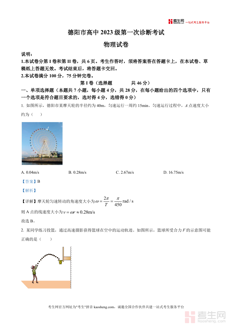《精品解析:2026届四川省德阳市高三上学期第一次诊断考试物理试题(解析版)》是一份聚焦高三物理备考的权威真题解析资料,针对德阳市高三第一次诊断考试物理试题展开全面解读,覆盖单项选择、多项选择、实验题及计算题等全题型内容;特色亮点在于对每道试题进行详实公式推导(如摩天轮线速度计算中角速度公式应用)与步骤拆解,精准提示易错点(如开普勒第二定律下近远月点速度比较误区),并融入本地考情分析,助力使用者深入理解物理核心知识点与解题逻辑。