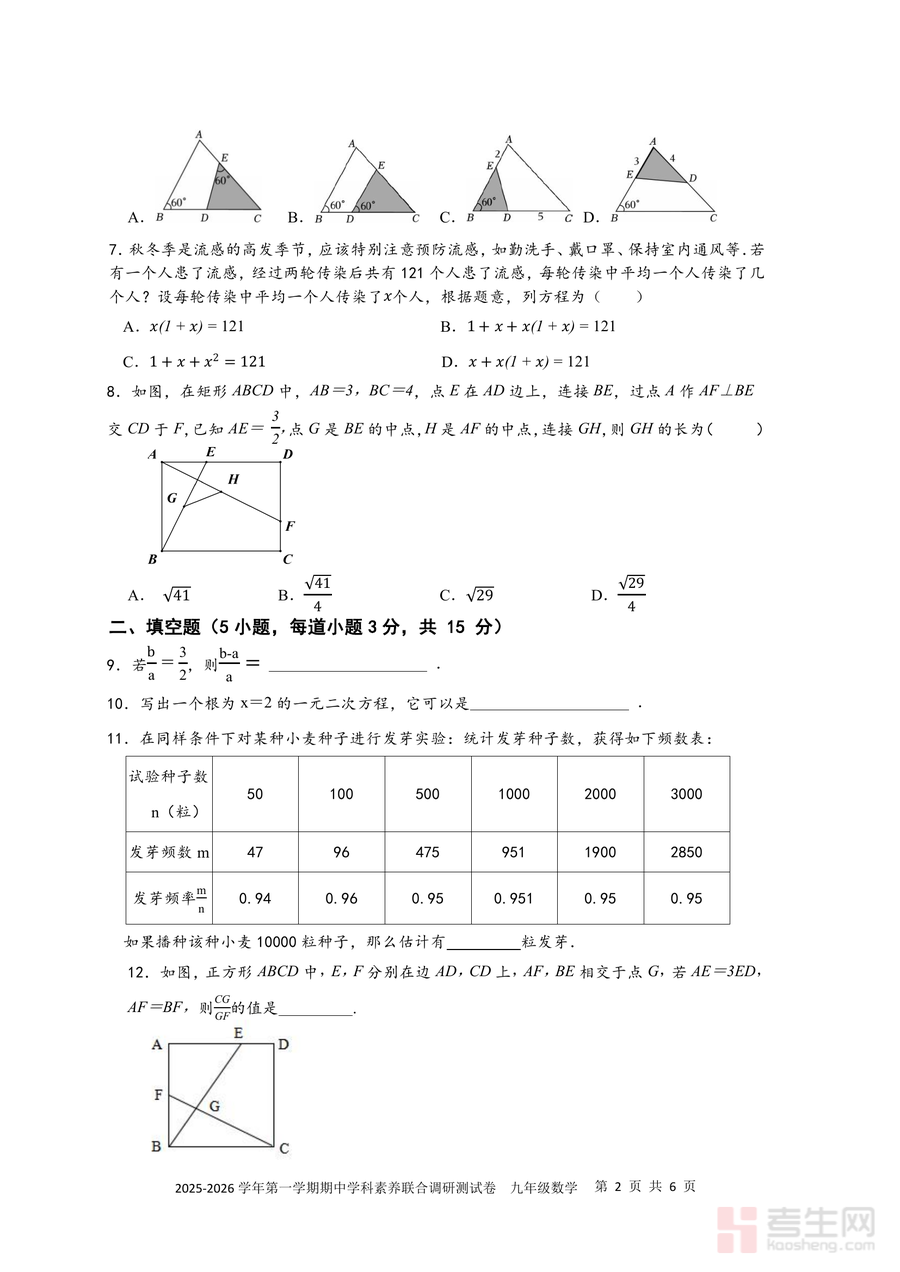 该试卷核心用途为九年级学生期中备考的真题训练材料,同时可作为教师评估教学效果与调整教学策略的参考依据。使用场景包括学生自主刷题巩固薄弱环节(如一元二次方程实际应用、相似三角形判定等考点)、学校组织模拟联考熟悉考试流程与时间分配、家教辅导时针对性讲解考点;用户价值在于通过真题解析能精准把握宝安区联考的考点分布与命题趋势,帮助学生提升应试能力——例如通过应用题中的流感传染问题掌握一元二次方程建模方法,通过几何综合题培养空间想象与逻辑推理能力;其备考优势还体现在能让学生提前适应联考题型结构,减少考试紧张感。
