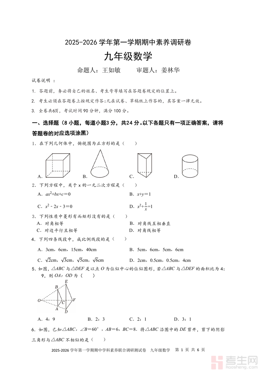 《2025年深圳市宝安区22校联考九年级上册期中数学试卷.pdf》是一份由宝安区22所学校联合命题、针对九年级上册数学知识进行综合测评的权威备考资料。试卷包含选择题(8小题,考查几何体俯视图、一元二次方程定义等基础知识点)、填空题(5小题,涉及比例性质、发芽频率估计等内容)及非选择题(7大题,涵盖解方程、统计分析、几何作图、实际应用题及综合实践探究等题型);命题规范严谨,明确标注命题人王如敏与审题人姜林华,题型设置贴合中考方向且难度梯度合理——基础题检验知识掌握程度,中档题侧重思维能力训练,综合题融合多个知识点(如位似图形面积比与线段比关系、图形旋转变换探究等),能全面反映学生阶段性学习成果。