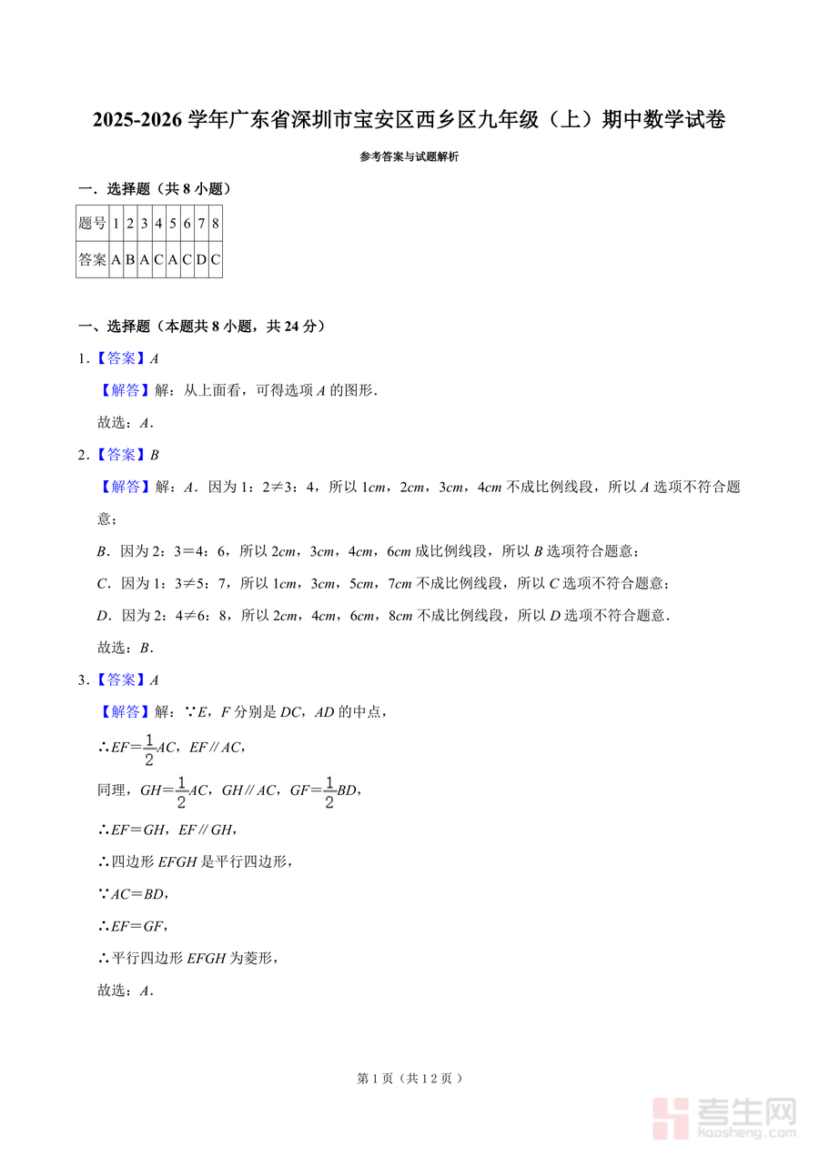 适用人群为广东省深圳市宝安区西乡区九年级学生,尤其适合需要系统梳理期中数学考点、提升解题效率的备考者。作为本地期中真题的配套答案解析,该资料具有不可替代性——它直接反映了区域命题方向与评分标准,长期价值在于帮助学生构建符合本地考试要求的知识体系,为后续中考备考奠定坚实基础。