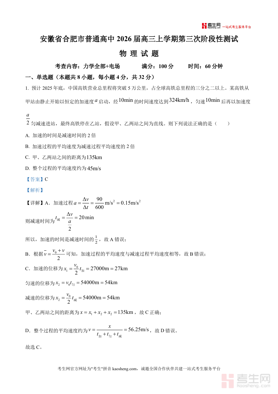 适用人群包括2026届安徽省合肥市及周边地区高三物理考生(尤其是需强化力学与电场模块的学生)、高中物理教师(可作为课堂例题或试卷评讲参考资料)及备考辅导人员;该资料的必要性在于紧密贴合当地模考命题趋势,解析详实且针对性强,能快速定位知识盲区并建立系统化解题思维——相较于普通习题集仅提供答案的局限,此解析版通过步骤拆解与规律总结实现从"会做题"到"会解题"跃迁,长期价值体现在奠定高考复习坚实基础,是高三物理备考不可或缺优质资料。