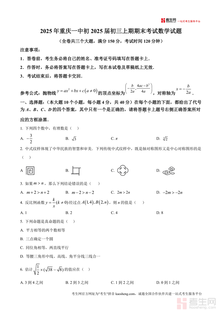 《精品解析:重庆市第一中学校2024-2025学年上学期期末考试九年级数学试题(原卷版)》是一份聚焦重庆一中九年级数学期末备考的核心真题资源,完整呈现该校该学年期末数学考试原题。全卷遵循“三个大题+满分150分+考试时间120分钟”标准结构,涵盖选择题(10小题共40分)、填空题(6小题共24分)、解答题(8小题共86分)三大模块;内容覆盖有理数概念、轴对称与中心对称图形判断等基础知识点及几何图形面积计算等综合题型,并融入“中式纹样对称”“中和数定义”等结合学科素养与创新思维内容,精准匹配教学重难点。