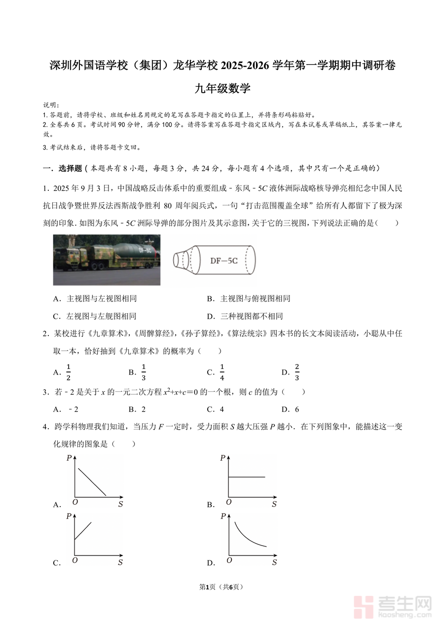 《深圳外国语学校(集团)龙华学校2025-2026学年第一学期期中调研卷.pdf》是一份聚焦九年级数学核心知识与能力的期中阶段性评估真题资料。该调研卷共6页,包含选择题(8道)、填空题(5道)、解答题(7道)三大题型,覆盖三视图识别、古典概型计算、一元二次方程求解、跨学科物理压强与反比例函数图像关联分析、相似三角形在测量中的应用、反比例函数k值推导、统计概率综合(条形图与扇形图结合)、图形变换(轴对称与位似作图)、菱形证明与边长计算、实际问题建模(荔枝产量增长率、长方体纸盒设计)、新定义"美好点"探究及等对边四边形综合应用等考点。其特色亮点在于融合跨学科元素(如物理与数学的结合)、设置创新性新定义题型,并结合生活场景设计问题,全面考查学生知识迁移能力与应试能力,是一份高质量备考资料。