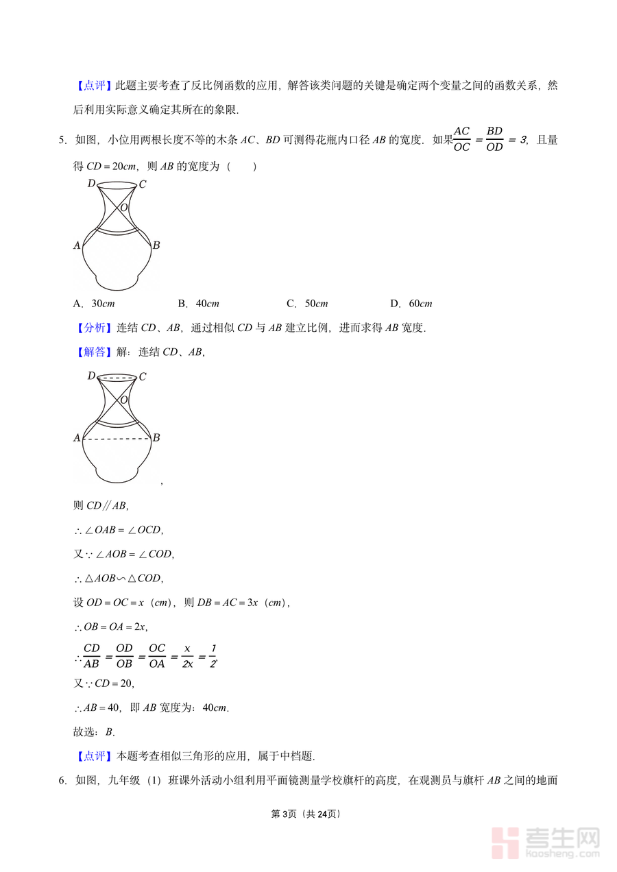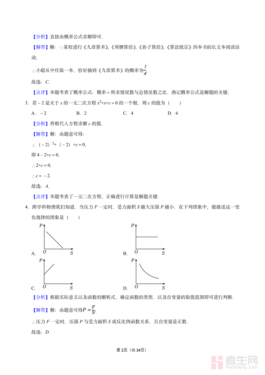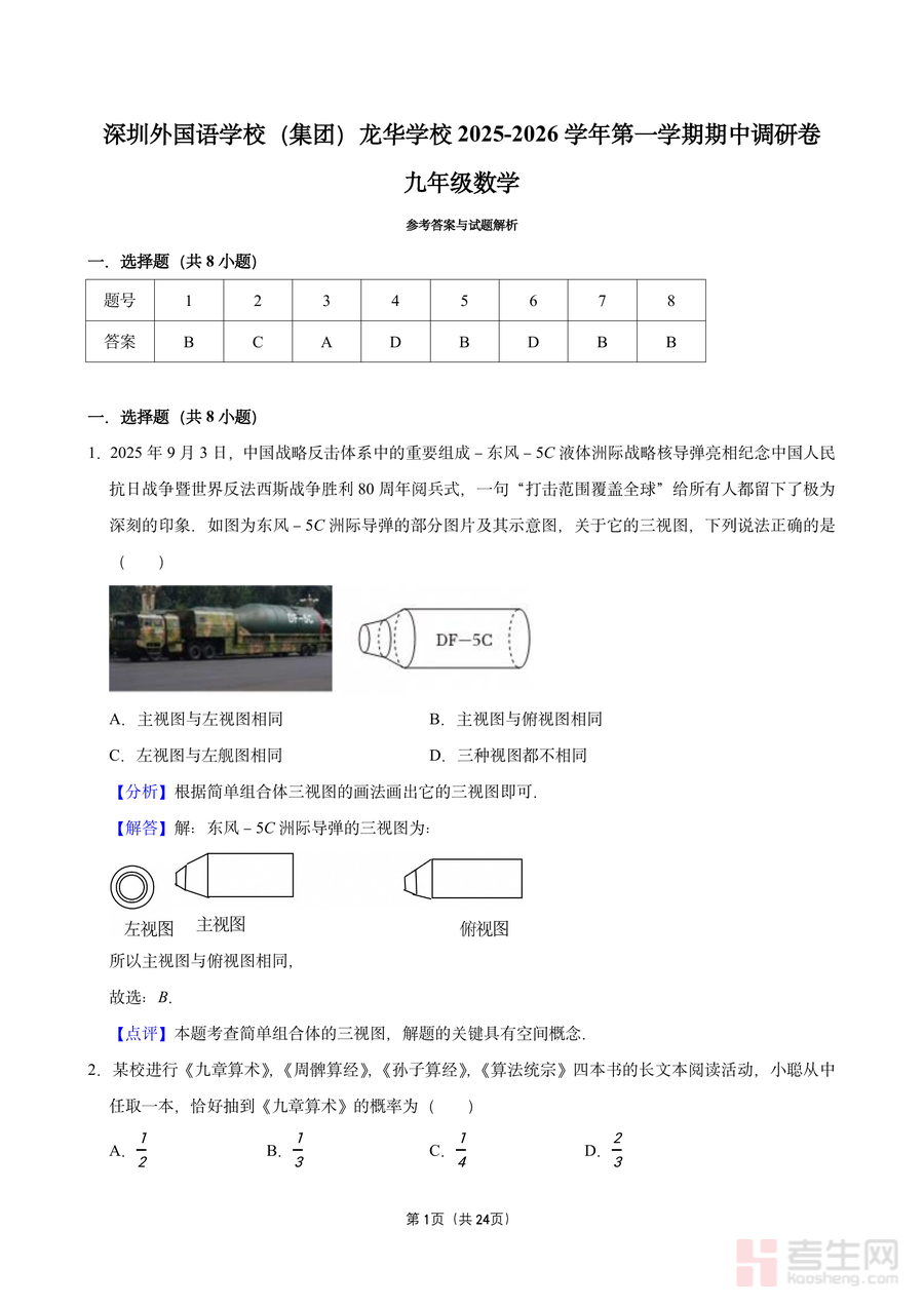 《深圳外国语学校(集团)龙华学校2025-2026学年第一学期期中调研卷答案.pdf》是一份针对该校九年级数学期中测评的官方配套备考资料,涵盖选择题、填空题等核心题型的参考答案及详细试题解析。文件内容不仅包含基础知识点如三视图判断、概率计算、一元二次方程根代入求解,还融入跨学科应用案例(如结合物理压强原理分析反比例函数图象)及实际场景问题(如利用平面镜测量旗杆高度、相似三角形计算花瓶口径)。每份试题解析均包含“分析”“解答”“点评”三部分,清晰梳理解题思路、步骤及考点本质,帮助使用者深入理解知识应用逻辑。