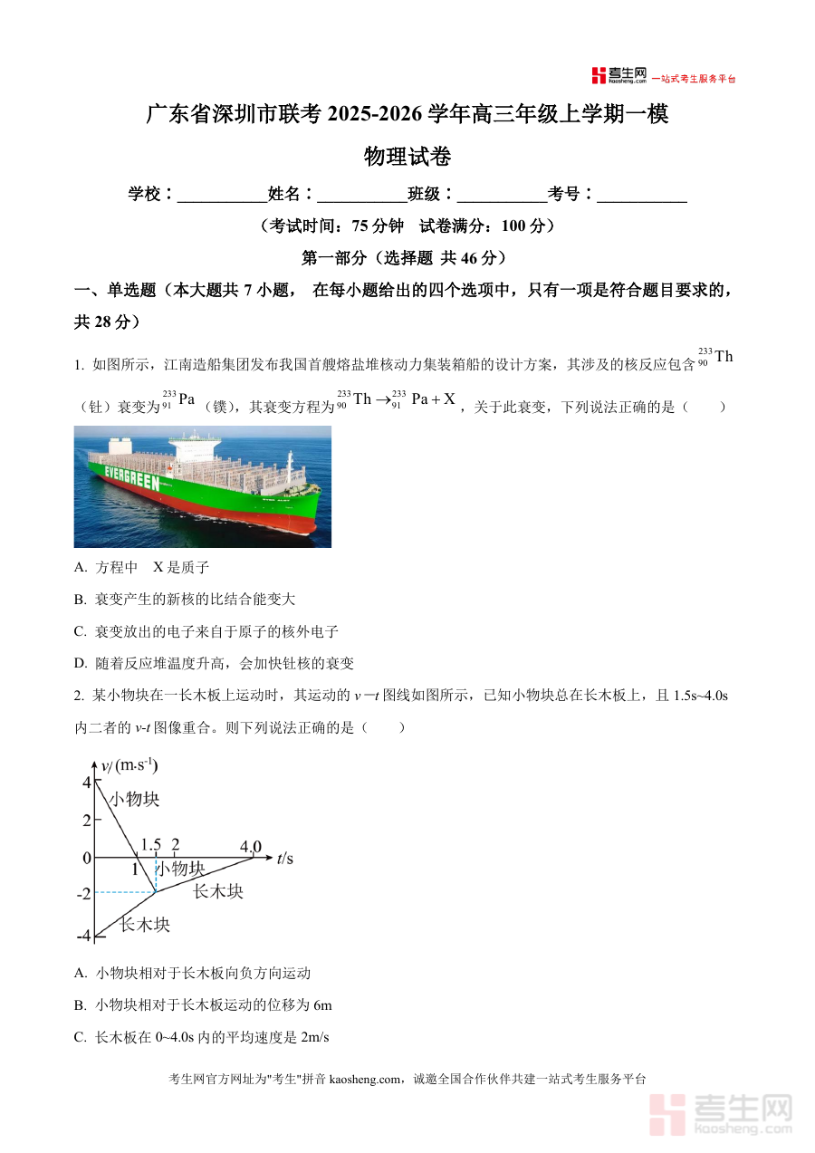 该资料核心用途为高三学生进行限时模拟测试以适应考试节奏,或用于考点查漏补缺及解题技巧打磨;使用场景包括课堂统一测试评估班级备考水平,学生自主刷题熟悉题型分布,教师备课参考把握本地命题趋势;用户价值在于帮助考生精准感知深圳地区联考对知识点考查深度,如通过核反应题巩固原子核物理基础,通过v-t图像题提升运动学综合分析能力;备考优势在于依托真实联考资源构建应试能力,有效缩短知识点掌握到考场应用转化周期,提升解题效率与准确率。