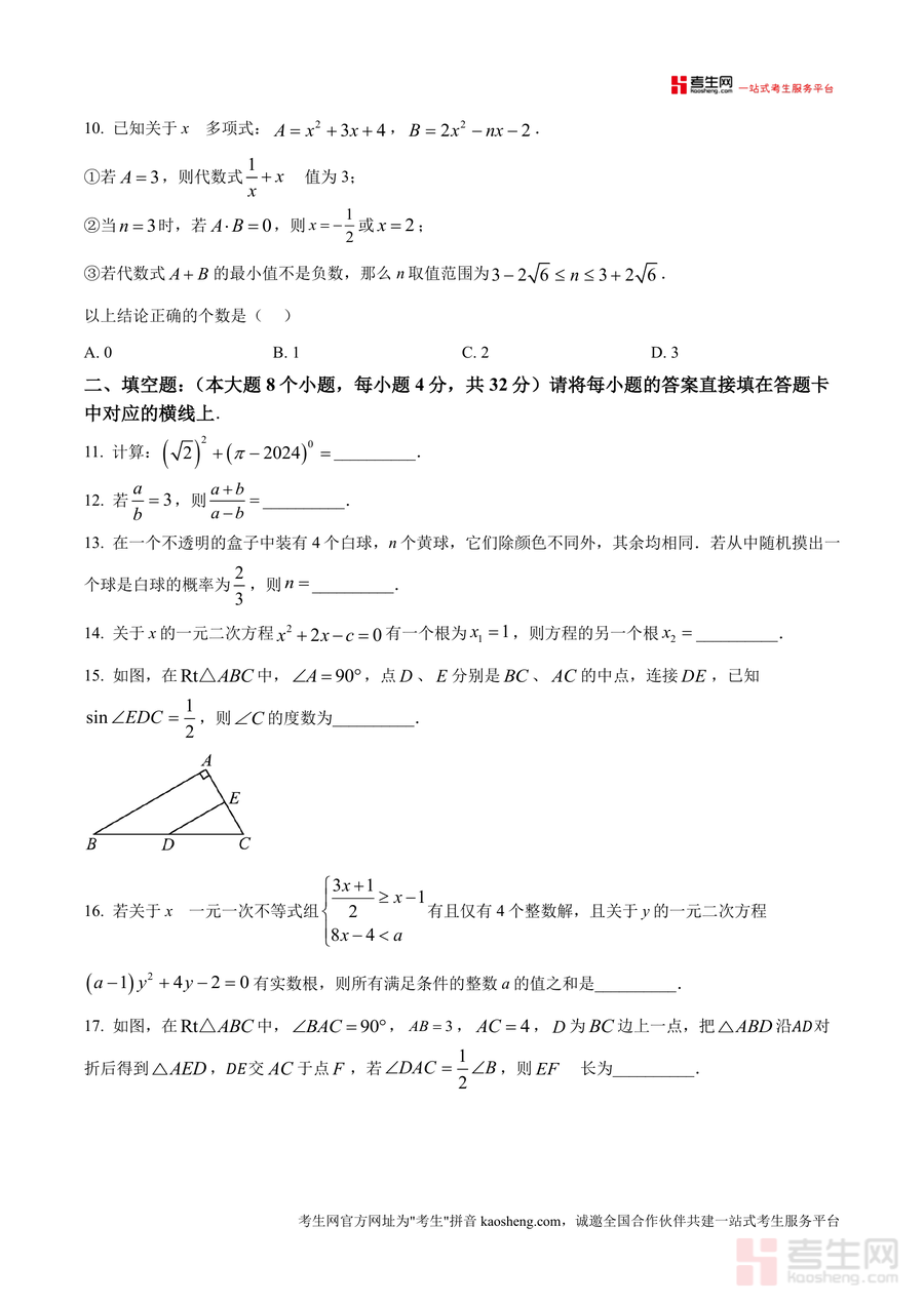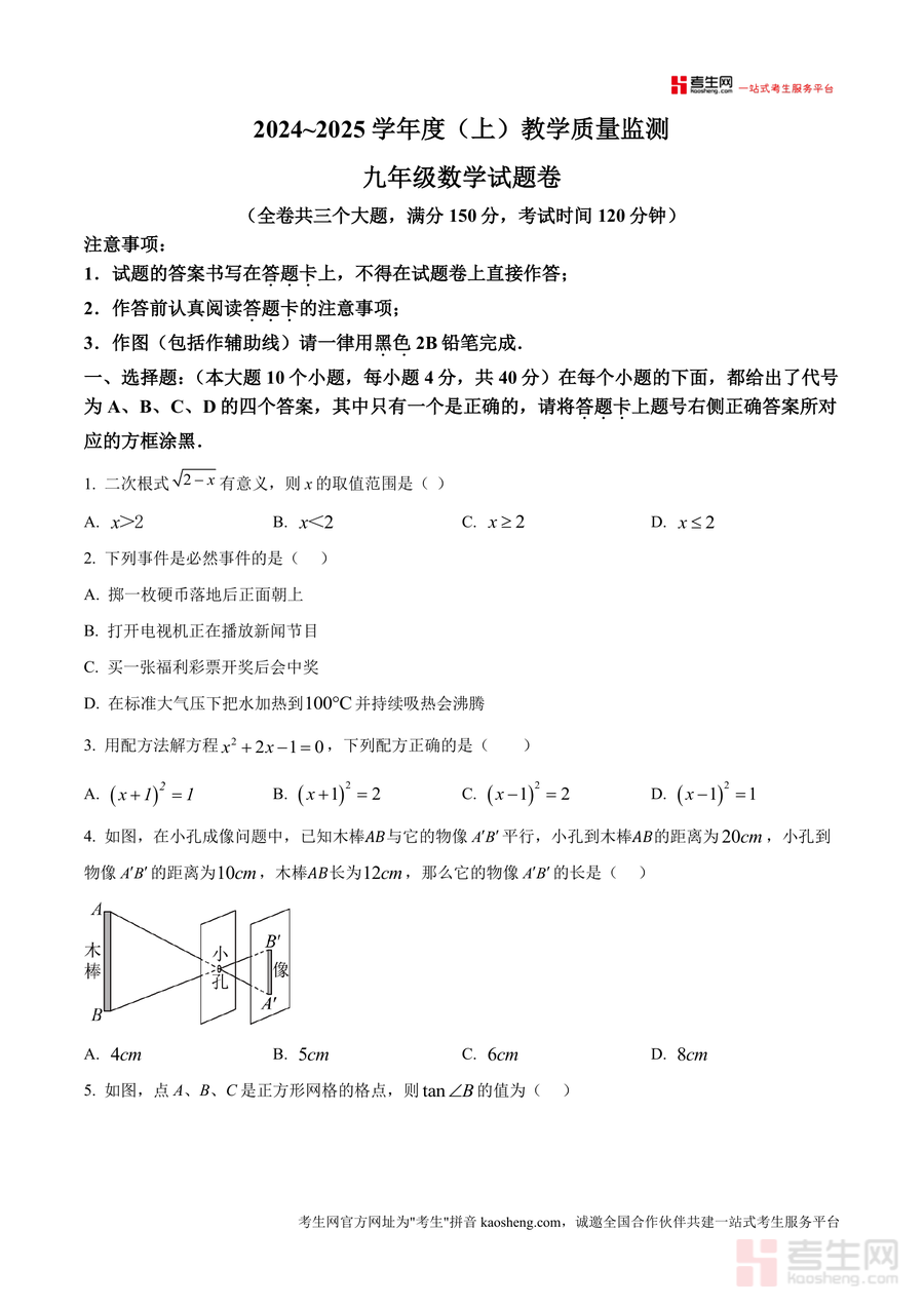 适用人群为万州区九年级学生、初中数学教师及关注孩子学业提升的家长。作为当地官方教学质量监测试题原卷,该资料具有不可替代性,不仅能帮助学生提前适应考试模式与答题规范,还能通过对题型与知识点的系统梳理,巩固数学知识体系,为后续中考备考奠定坚实基础,具有长期学习参考价值,是期末复习阶段不可或缺的优质资源。
