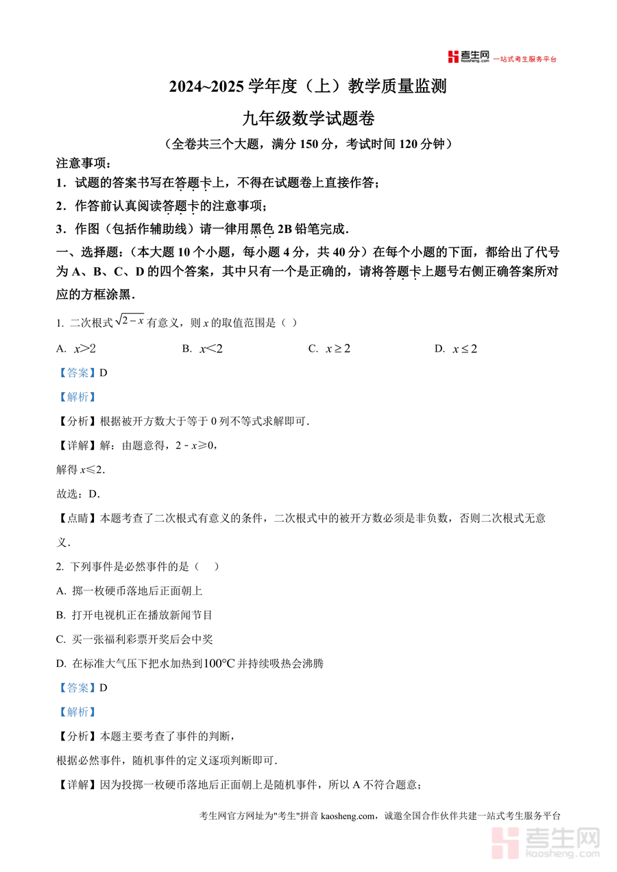 适用人群为重庆市万州区九年级在校学生数学教师及家长群体。作为本地最新期末真题解析资料其必要性体现在精准匹配区域考情不可替代性在于提供贴合本地教学要求解题范式长期价值则在于帮助学生构建系统知识框架为后续中考备考奠定坚实基础。