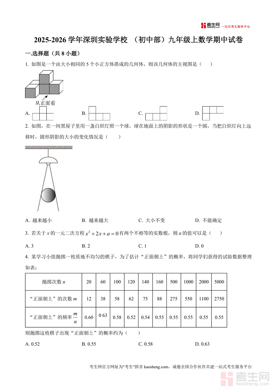 《精品解析:广东省深圳实验学校(初中部)2025-2026学年九年级上学期数学期中试卷(原卷版).docx》是一份聚焦深圳实验学校九年级上学期数学期中考核需求的权威真题原卷资料。试卷包含选择题8小题、填空题5小题、解答题7小题三大题型模块,覆盖几何体主视图判断、概率估计、一元二次方程根判别式应用、反比例函数图像性质、几何图形证明与计算等九年级上学期核心知识点,完全贴合该校教学进度与命题风格,能真实反映期中考核重点与难度梯度,为学生提供原汁原味校考真题体验。