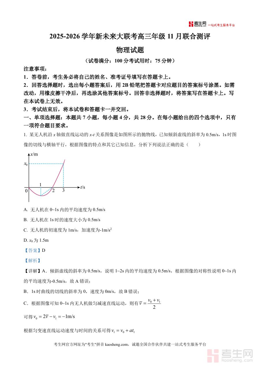 《精品解析:2026届河南省南阳市新未来大联考高三上学期模拟预测物理试题(解析版).docx》是一份面向2026届河南省南阳市高三学生的高质量物理备考资料。该资料包含2025-2026学年新未来大联考高三年级11月联合测评完整物理试题及深度解析版,内容覆盖单项选择题(7小题)、多项选择题(3小题)、非选择题(5小题)三大题型,涉及匀变速直线运动图像分析、电场电势φ-x关系、天体运动轨道规律、力学平衡与能量转化等核心知识点。其特色亮点在于解析专业详实,每道题均提供选项正误判断依据、原理推导及关键公式应用,如对无人机x-t图像题通过对称性分析平均速度,结合匀变速规律推导初速度与加速度;对示波管结构题深入解读加速电场与偏转电场对电子运动的影响,助力学生精准掌握解题逻辑与核心考点。