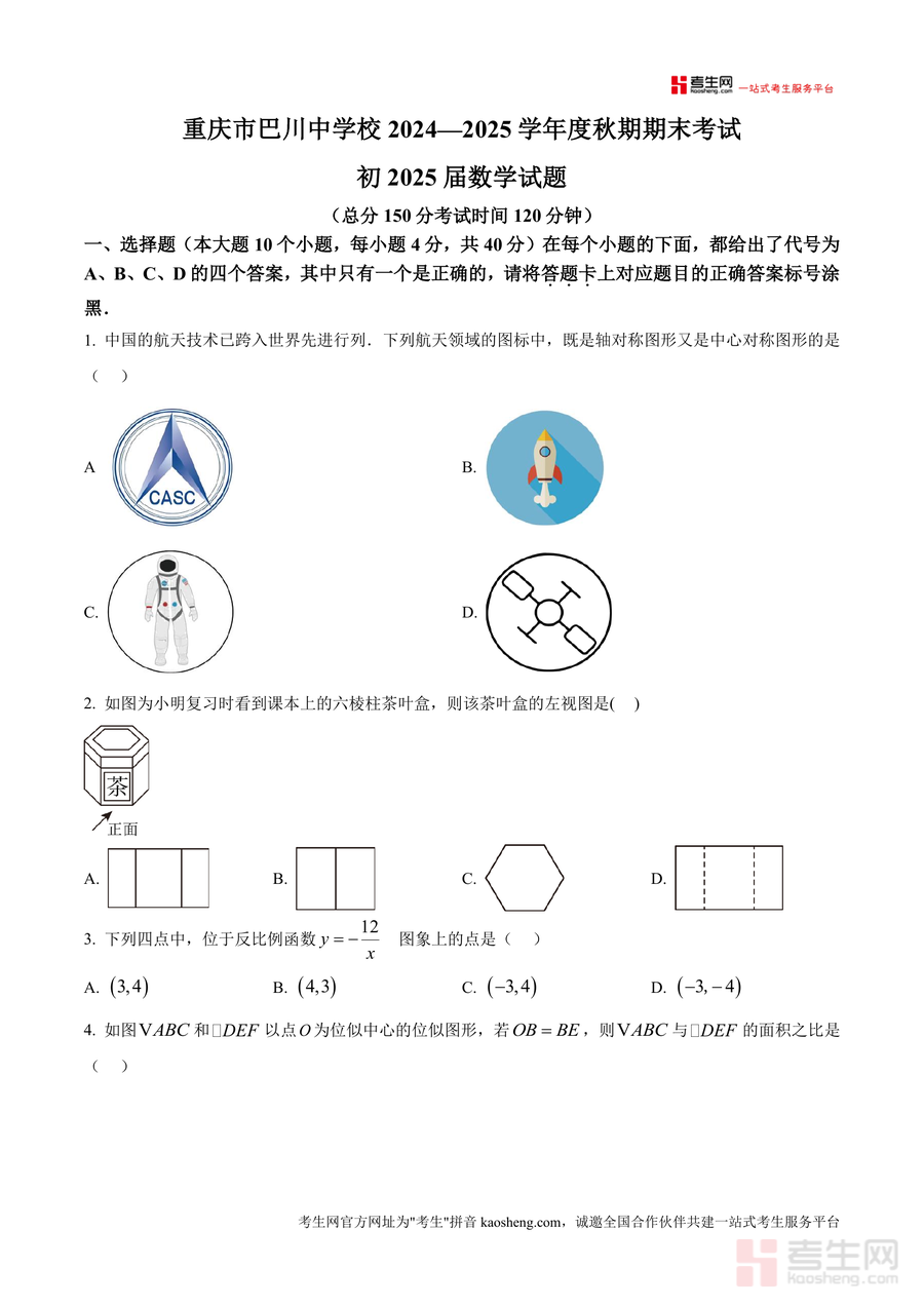 《精品解析:重庆市巴川中学校2024-2025学年九年级上学期期末考试数学试题(原卷版)》是一份针对九年级学生数学期末备考的权威真题资料,依托重庆巴川中学优质教学资源编制。该试题包含选择题(10题40分)、填空题(8题32分)、解答题(8题78分)三大题型,覆盖轴对称与中心对称图形判断、几何体视图、反比例函数图像性质、位似图形面积比、圆外接圆角度计算、一元二次方程根判别式等九年级上册核心知识点。其特色亮点在于保持试题原貌,题型分布贴合重庆本地中考命题趋势,题目设置兼具基础性与综合性,能帮助学生精准把握考试重点与难度梯度。