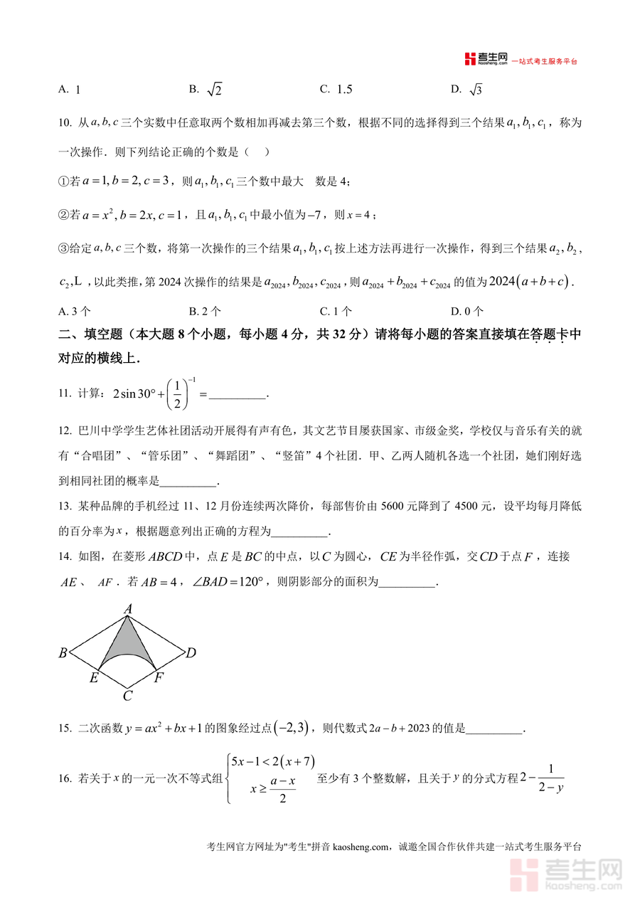 本资料适用于重庆市及周边地区九年级学生,特别是备战期末考及提前规划中考数学复习者;也适用于初中数学教师作为教学资源补充。该原卷版真题是九年级数学期末备考不可或缺之资料,其不可替代性在于它是巴川中学最新期末试题,真实反映该校教学水平与考试导向;长期价值在于可作为后续中考复习时的经典题型参考素材,帮助学生巩固基础知识点、提升解题思维与技巧,为中考数学取得优异成绩奠定坚实基础。