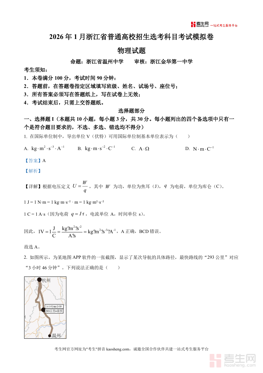 《精品解析:2026届浙江省七校联盟高三上学期一模物理试题(解析版).docx》是一份面向浙江省2026届高三物理选考学生打造 的权威备考资料与真题解析文本,由温州中学命题、金华第一中学审核,贴合浙江选考命题趋势与核心考点要求。文件包含完整模拟卷(含考生须知、选择题I/II等题型)及逐题详细解析:试题覆盖国际单位制推导、质点模型应用、核反应守恒定律等基础考点与天体运动开普勒定律、电磁感应综合等重难点内容;解析部分采用"答案+详解"模式,如第1题通过功与电荷单位推导伏特的基本单位表达式,第2题区分时刻与时间间隔、平均速率与瞬时速度等易错概念,精准击破知识盲区。