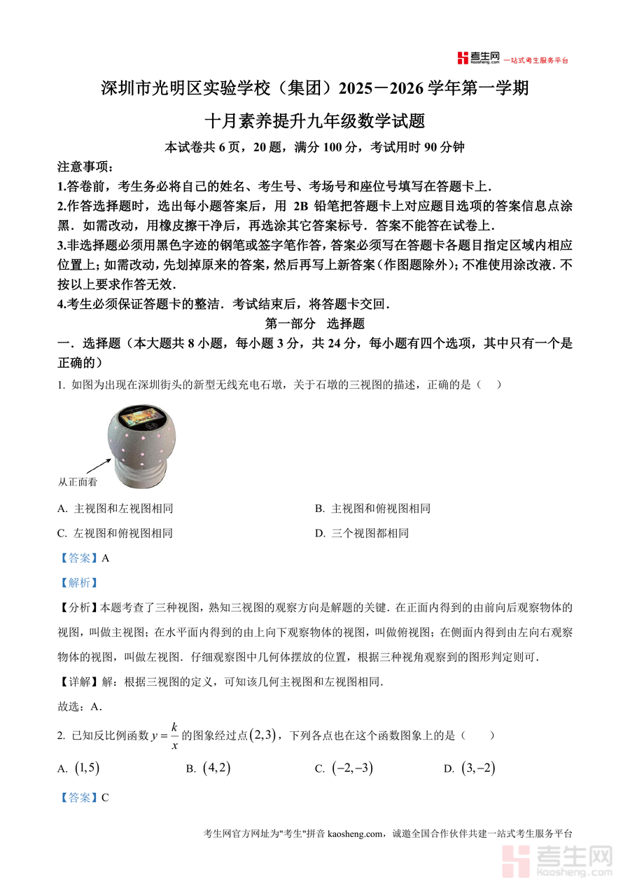 《精品解析:广东省深圳市光明区实验学校2025-2026年九年级上学期期中考试数学试题(解析版).docx》是一份针对该校九年级上册期中数学考试的精准备考资料,包含完整试题(8道选择题、5道填空题、7道解答题)及详尽解析。资料贴合该校教学进度与命题风格,每道题均配有考点分析、规范解题步骤及关键知识点标注(如三视图判定、反比例函数图像性质、平行线分线段成比例定理等),解析过程注重逻辑推导与方法总结,帮助学生快速把握题型规律与解题技巧。