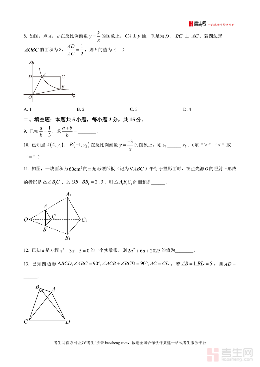 《精品解析:广东省深圳市北京师范大学南山附属学校中学部2025-2026学年九年级上学期期中数学试卷(原卷版).docx》是一份针对该校九年级学生期中备考的高质量原卷资料。该试卷严格遵循九年级上学期数学教学大纲要求编制,包含选择题8小题(共24分)、填空题5小题(共15分)及解答题7小题(共61分),覆盖一元二次方程解法、几何图形投影与视图、黄金分割应用、反比例函数图象性质、概率计算等核心知识模块。其特色在于题目设计贴合该校教学实际与命题风格,如结合榫卯结构考查俯视图、通过矩形菜地问题考查方程建模等,能真实反映学生对本学期重点内容的掌握情况,是一份极具参考价值的备考资料。