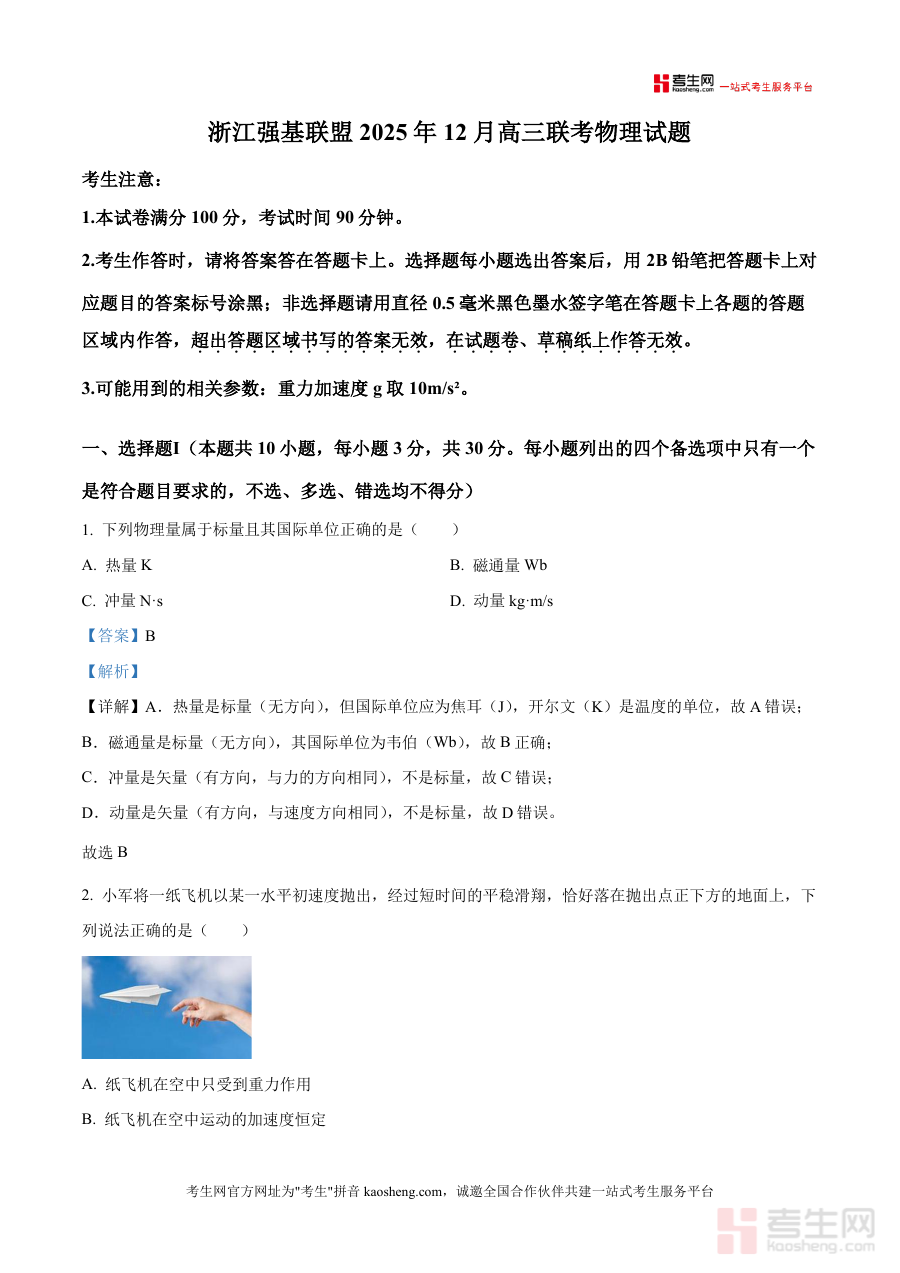 《精品解析:2026届浙江省强基联盟高三上学期二模物理试题(解析版)》是一份针对浙江省强基联盟高三年级物理联考编写专业备考资料,包含完整试题及逐题深度解析。资料覆盖选择题Ⅰ、Ⅱ等题型,每道题目均结合学科知识点展开详细分析,如对磁通量标量属性及单位正确性辨析、斜抛运动质点模型应用条件等,通过对比选项差异明确解题思路,融入"真题解析"核心要素,兼具权威性与实用性。