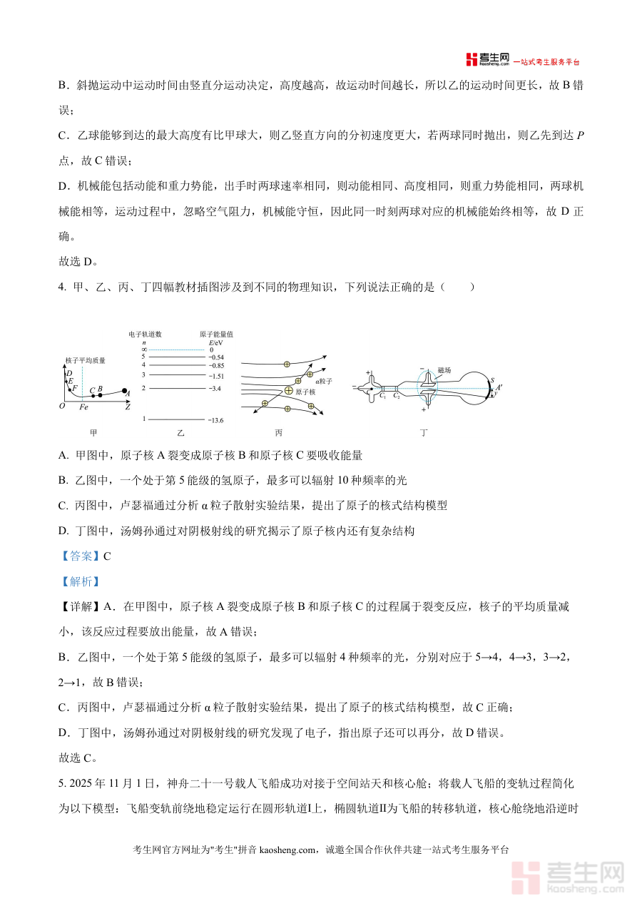 该资料适用于高三学生日常练习后的错题复盘、模拟测试前的题型熟悉,以及教师教学中的案例参考场景。其核心价值在于帮助学生掌握浙江强基联盟考试命题规律与难度梯度,通过解析中神舟飞船变轨模型、LC振荡电路工作原理等知识点应用强化应试能力;同时针对光电效应截止频率与遏止电压关系等易混概念提供清晰逻辑推导,助力突破备考瓶颈。