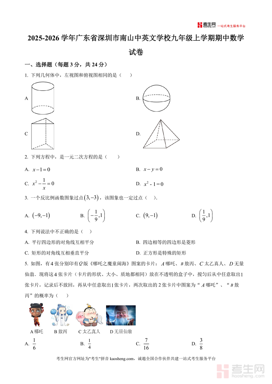 《精品解析:广东省深圳市南山中英文学校2025-2026学年九年级上学期期中数学卷(原卷版)》是一份针对深圳南山中英文学校九年级学生期中备考需求设计的真题类备考资料。该资料完整呈现了该校期中数学考试的原卷内容,涵盖选择题(如几何体视图判断、一元二次方程识别)、填空题(如矩形对角线计算、投影应用)及解答题(如方程求解、概率统计分析、几何证明与坐标变换)三大题型,覆盖九年级上学期核心知识点,包括几何图形性质(菱形、矩形、正方形)、代数方程解法(一元二次方程)、概率统计应用(频率估计概率)及反比例函数综合等,其特色在于严格还原真题原貌,保留题目序号、分值分布及题型结构,为学生提供真实的考试场景体验。