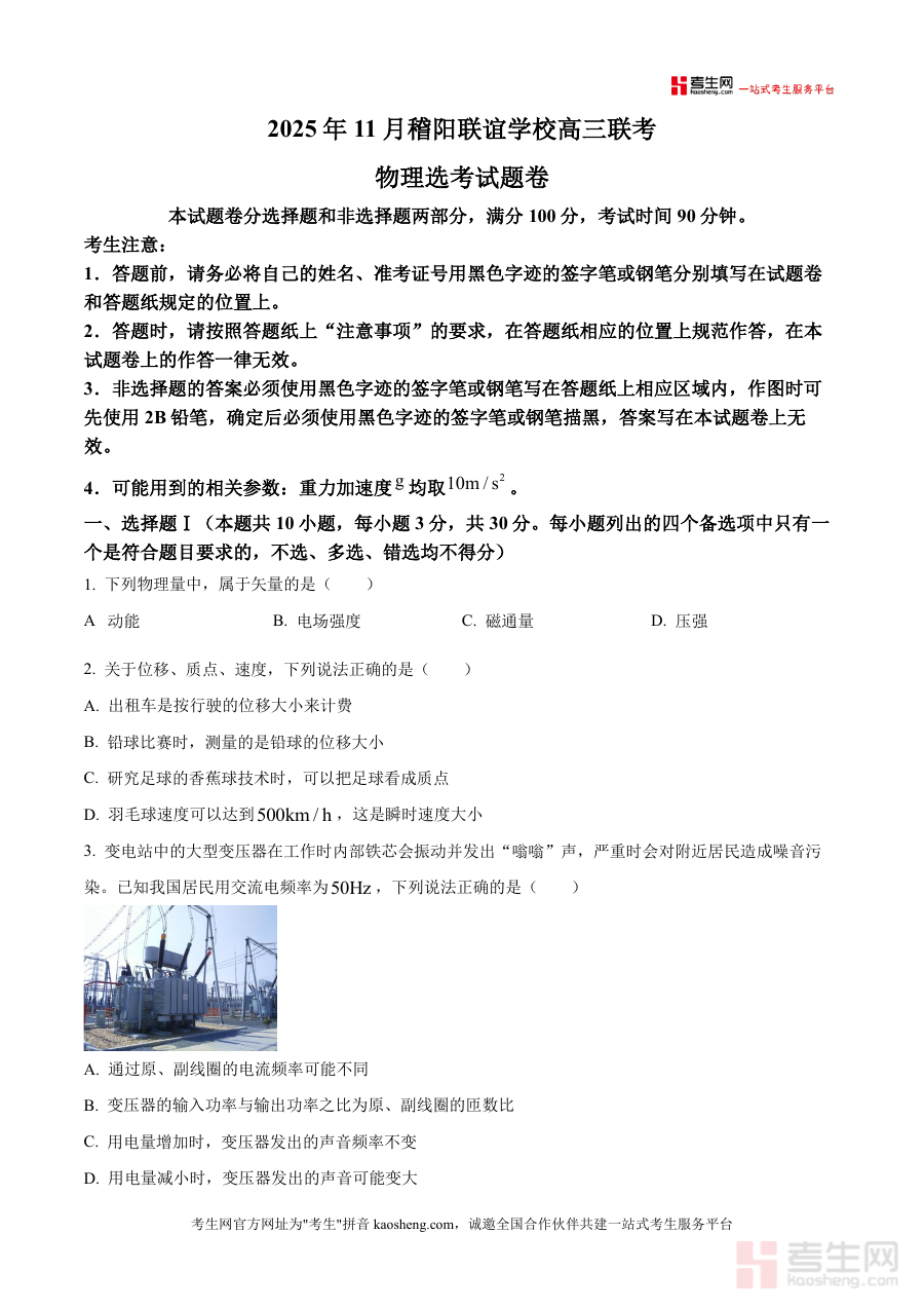 本资料适用于2026届浙江省高三物理选考生及相关教师群体;作为稽阳联谊学校权威联考真题原卷版资料具有不可替代性,是考生巩固学科基础、提升解题能力必要工具;长期价值在于培养考生科学解题思维与严谨答题习惯,为后续高考物理备考奠定坚实基础,助力考生实现成绩突破。