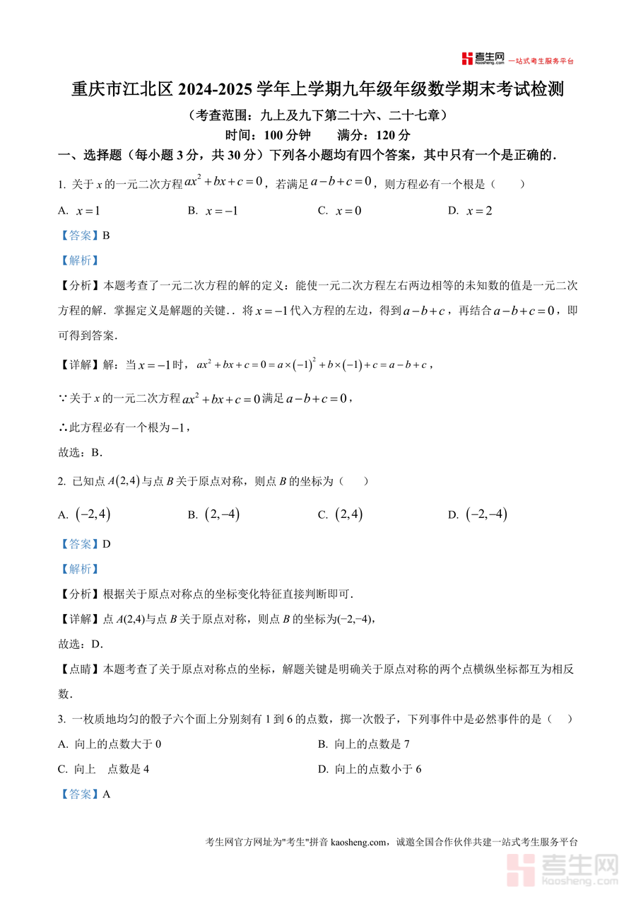 《精品解析:重庆市江北区2024-2025学年上学期九年级年级数学期末考试检测(解析版).docx》是一份针对本地九年级期末数学考试真题编制的数据化备考资料。该资料严格遵循江北区考纲要求,考查范围覆盖九上全册及九下第二十六、二十七章核心内容,题型包含选择、填空、解答三大类,每道题目均配备详细分析、规范解答步骤及精准点睛总结,既呈现真题原貌,又融入考点深度解读与解题技巧提炼,能帮助使用者快速把握区域命题特点。