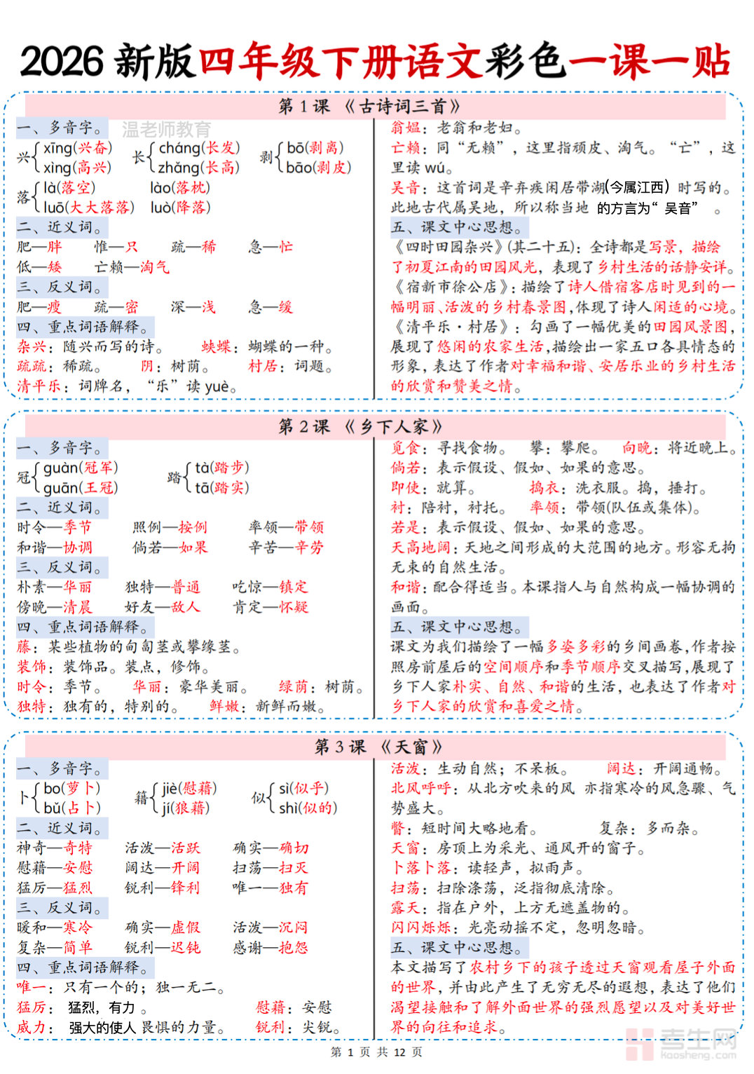 26 春小学语文一课一贴(四年级下)紧扣统编版教材,逐课梳理生字词、课文主旨、修辞方法、写作技巧等核心知识点,兼顾基础巩固与能力提升。内容贴合四年级学生认知特点,由浅入深讲解知识要点,配套典型例题与练习,帮助学生系统掌握课文内容、突破学习难点,全面提升语文阅读与写作能力。请添加微信 18617049513 进专属群,获取更多免费资源!