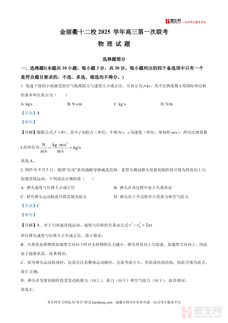 《精品解析:2026届浙江省金丽衢十二校高三上学期第一次联考物理试题(解析版)》是一份针对浙江省高三物理备考的高质量真题解析资料,聚焦金丽衢十二校联考这一区域性重要模拟考试内容。资料涵盖选择题Ⅰ(10小题)及选择题Ⅱ(3小题)等核心题型,每个题目均配备详尽解析,包含公式推导、几何关系分析及实际情境关联(如东风导弹发射运动分析、嗒嗒球飞行轨迹研究等)。其特色亮点在于结合浙江高考考纲要求,注重解题思路引导与考点拆解,帮助学生理解物理概念在实际问题中的应用,同时通过规范步骤培养严谨答题习惯,助力学生构建系统的知识体系。