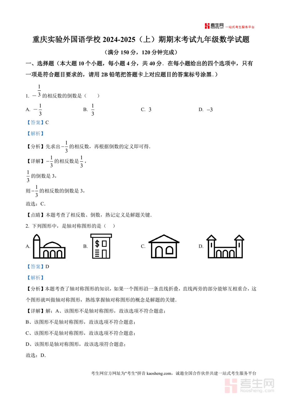 本资料适用于重庆市九龙坡区及周边区域九年级学生、初中数学教师及关注孩子数学备考的家长。作为本地名校期末真题解析,它不仅帮助学生熟悉考试题型与难度,还通过规范解析培养科学答题习惯。相比普通练习题,其真题权威性与解析深度不可替代——尤其是压轴题如几何折叠问题、函数综合题等复杂题型的分步解析,能有效提升应试能力,具有长期参考价值,是九年级数学期末备考必备资料。