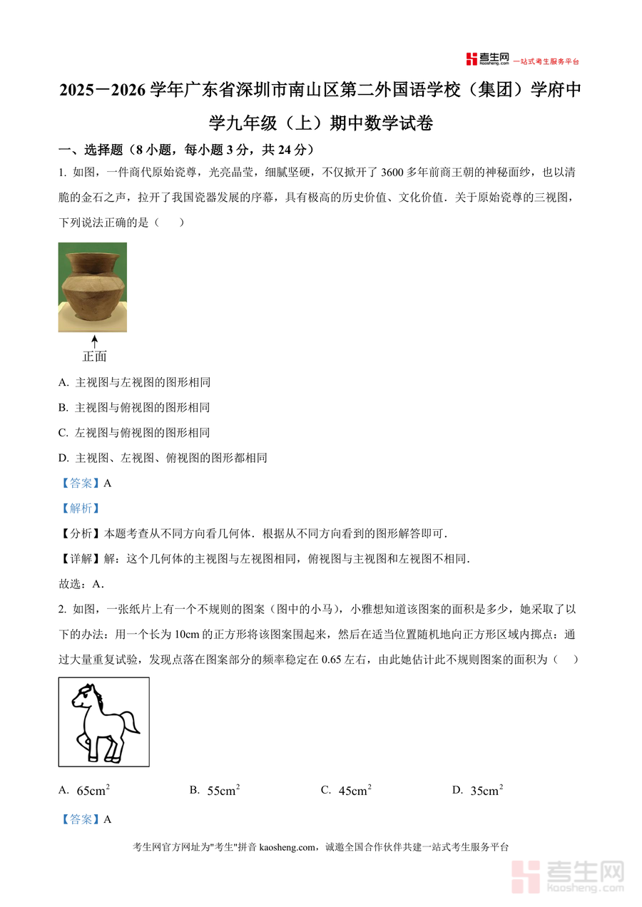 《精品解析:广东省深圳市南山区第二外国语学校(集团)学府中学2025-2026学年九年级上学期期中数学试卷(解析版).docx》是一份针对该校九年级学生期中数学备考设计高质量真题解析资料,涵盖选择题、填空题、解答题三大题型共15道题目。资料以真题为核心载体,每道题目均配备详尽解析:不仅梳理基础知识点如三视图判断、相似三角形应用、反比例函数性质等,还融入解题思路分步推导与易错点提示,例如第2题不规则图案面积估算,解析清晰呈现"频率估计概率+正方形面积计算"方法;第4题四分仪测量井深问题,通过相似三角形判定与性质推导井深计算过程,实现知识与实际场景结合。作为精准匹配该校教学进度命题风格的真题解析,其特色在于深度与实用性兼顾,助力学生掌握考点本质。