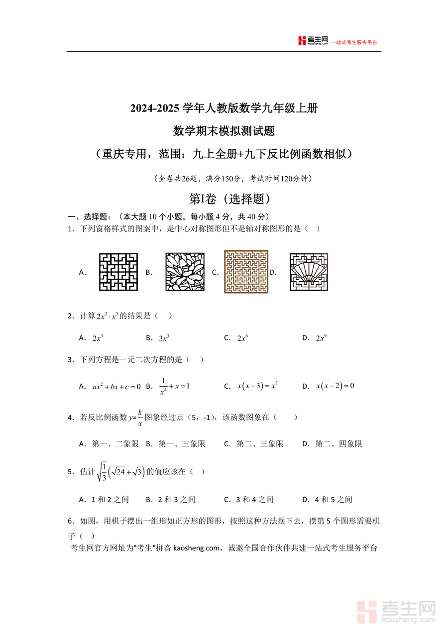 《重庆九年级上学期期末检测卷02(人教版)(原卷版).docx》是一份针对重庆地区九年级学生设计的数学期末备考资料。文件以2024-2025学年人教版数学教材为依据,覆盖九年级上册全册内容及九年级下册反比例函数、相似图形等前置核心知识点,全卷共26题(含10道选择题、8道填空题、8道解答题),满分150分,考试时间设定为120分钟,完全贴合重庆本地期末检测的题型结构与难度梯度。其特色在于严格遵循重庆中考命题趋势与本地教学要求,题目设计兼顾基础巩固与能力提升,并融入中心对称图形判断、一元二次方程求解、反比例函数性质应用等高频考点,为学生提供精准适配的复习载体。
