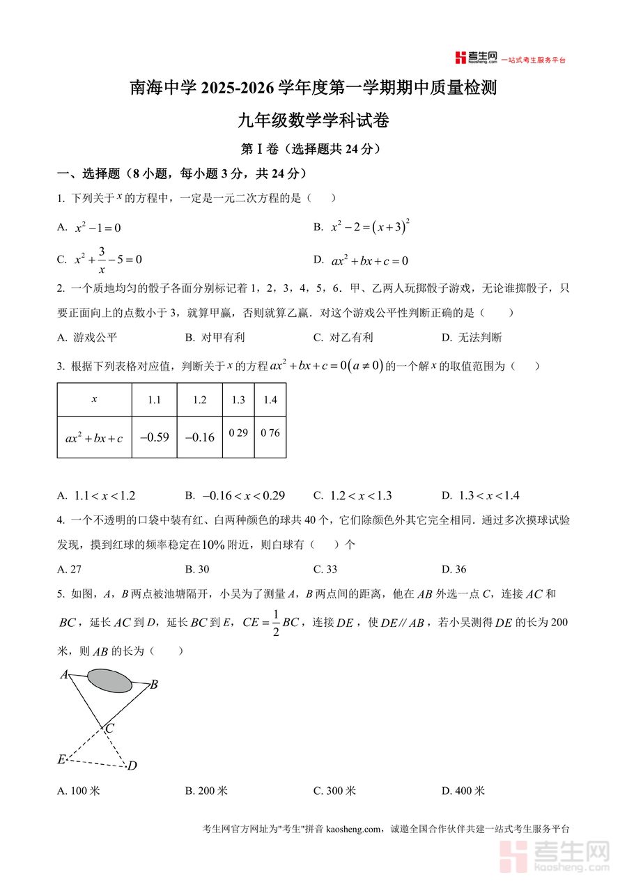 《精品解析:广东省深圳市南山实验教育集团南海学校2025-2026学年九年级上学期期中考试数学试题(原卷版)》是一份针对九年级数学期中备考的优质真题资料。该资料完整呈现了本校期中测试题型结构,包含选择题(8小题24分)、填空题(5小题15分)、解答题(7大题61分)三大模块,覆盖一元二次方程求解、概率统计应用、几何图形变换(如旋转、位似)等核心知识点,题目设计贴合本校教学进度与命题风格,保留了原卷真实分值分布与考点布局,隐含对本地教研方向与考点趋势的精准捕捉,为备考提供真实场景参考。