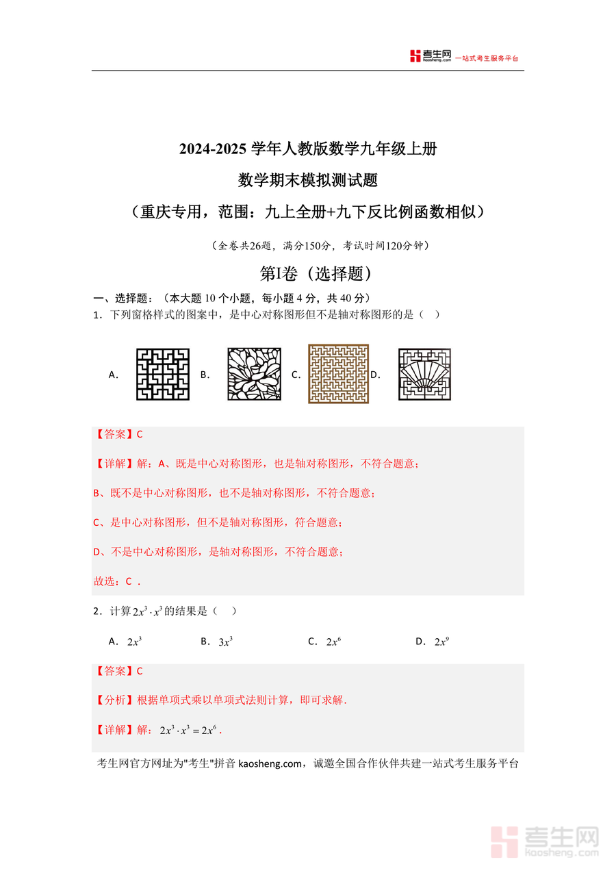 适用人群为重庆地区使用人教版教材的九年级数学学生。作为期末备考的关键资料,它的必要性体现在精准覆盖考点与本地考情,不可替代性在于解析深度与题型针对性,长期价值则在于帮助学生构建系统知识框架,强化解题思维,为后续中考复习奠定坚实基础。