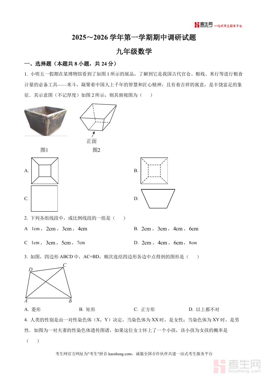 这份原卷版资料具有明确实用价值,可用于参与调研考试学校九年级学生提前熟悉考试试卷结构与考查形式,帮助学生备考时精准把握期中阶段检测重点;同时可为学校教师提供区域联合考试真实试卷样本,辅助教师进行学情诊断与教学策略调整,确保教学与区域考查要求相契合。