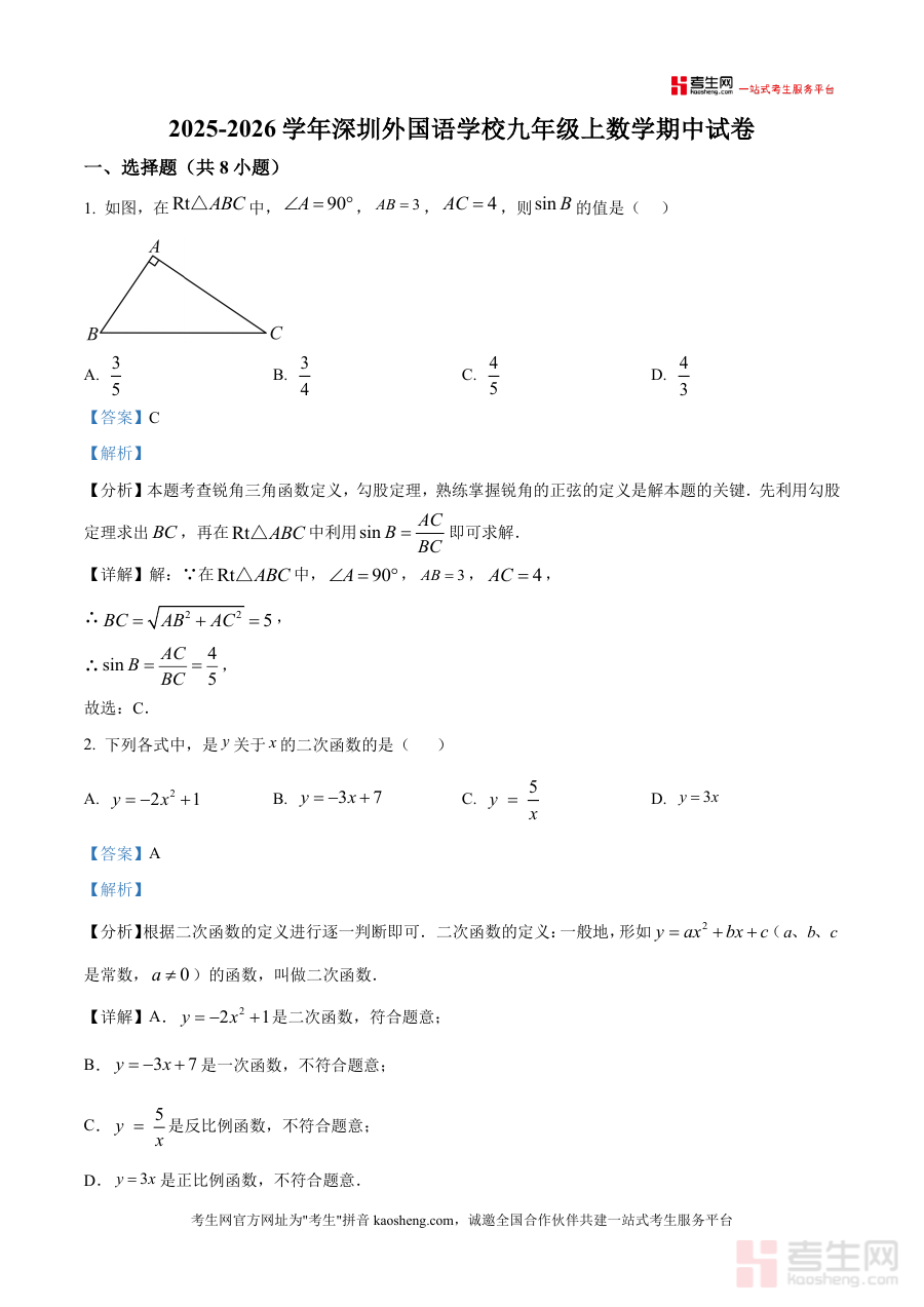 《精品解析:广东省深圳市深圳外国语学校2025-2026学年九年级上学期期中考试数学试题(解析版).docx》是一份针对广东省深圳市深圳外国语学校2025-2026学年九年级上学期期中考试数学科目的专业备考资料,包含该次考试完整试题及对应详细解析内容,严格贴合该校该学期期中考试数学学科命题背景与考查方向,为相关使用者提供精准备考支持。