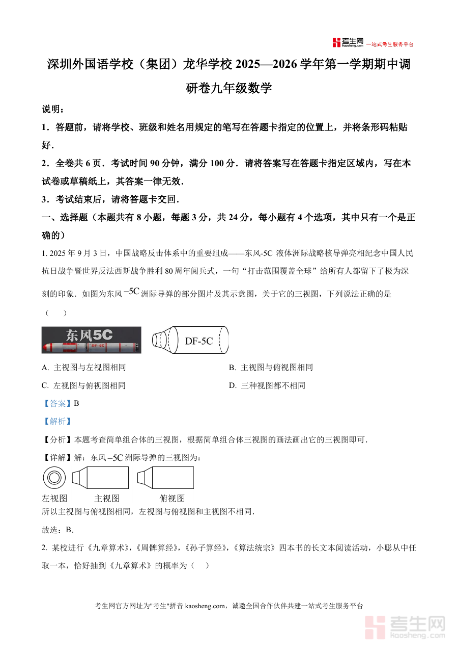 《精品解析:广东省深圳市深圳外国语学校(集团)龙华学校2025-2026学年上学期九年级数学期中调研卷(解析版).docx》是一份针对广东省深圳市深圳外国语学校(集团)龙华学校在2025-2026学年上学期举行九年级数学期中调研考试而编制的数据资料。该资料包含对学校官方发布期中调研卷的详细解析,旨在帮助相关人员系统掌握相关知识体系,提升数学应用能力。作为专业备考资料,它严格遵循学校教学进度安排及考试要求,能够有效辅助相关人员进行期中复习工作。