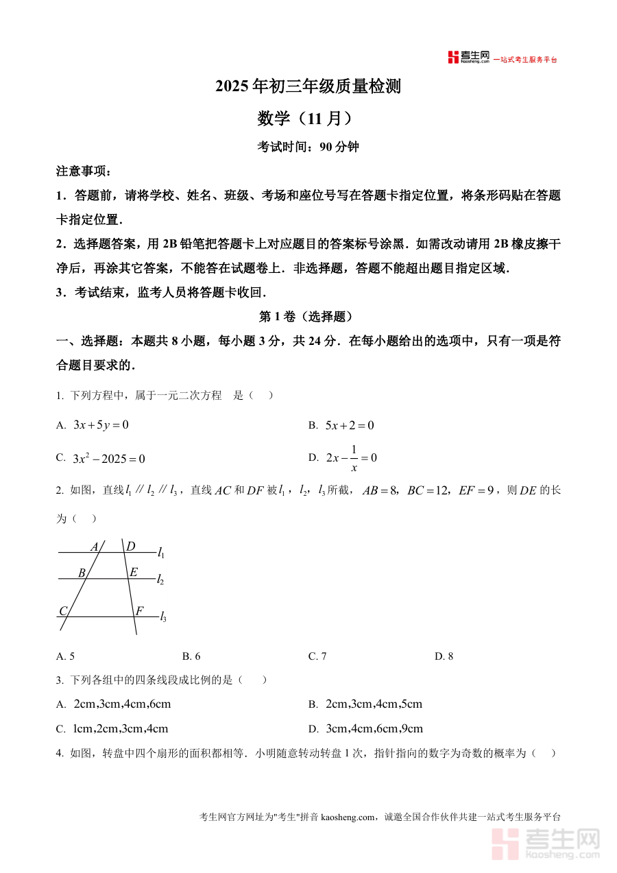 适用人群主要包括广东省深圳市福田区红岭实验学校(新洲)2025-2026学年上学期在读九年级学生,以及负责该校该年级数学教学工作的教师团队。作为学校官方发布的期中考试原卷版资料,其核心价值在于还原真实考试场景,帮助师生准确把握阶段学习成果,为后续学习与教学策略优化提供可靠依据,是阶段教学与备考过程中的重要辅助资源。