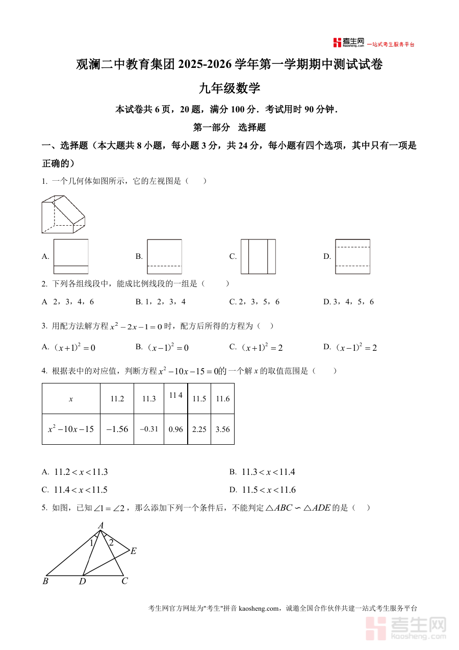 《精品解析:广东省深圳市观澜第二中学教育集团2025-2026学年九年级上学期期中数学试卷(原卷版).docx》是一份针对广东省深圳市观澜第二中学教育集团2025-2026学年九年级上学期期中数学测试编写的原卷版备考资料。该资料对应九年级上学期期中阶段数学考试需求,符合该教育集团期中测试安排与要求,体现了对九年级学生上学期数学知识掌握情况进行阶段性考查的目标,为使用者提供了与实际考试形式一致且结构完整的试卷版本。