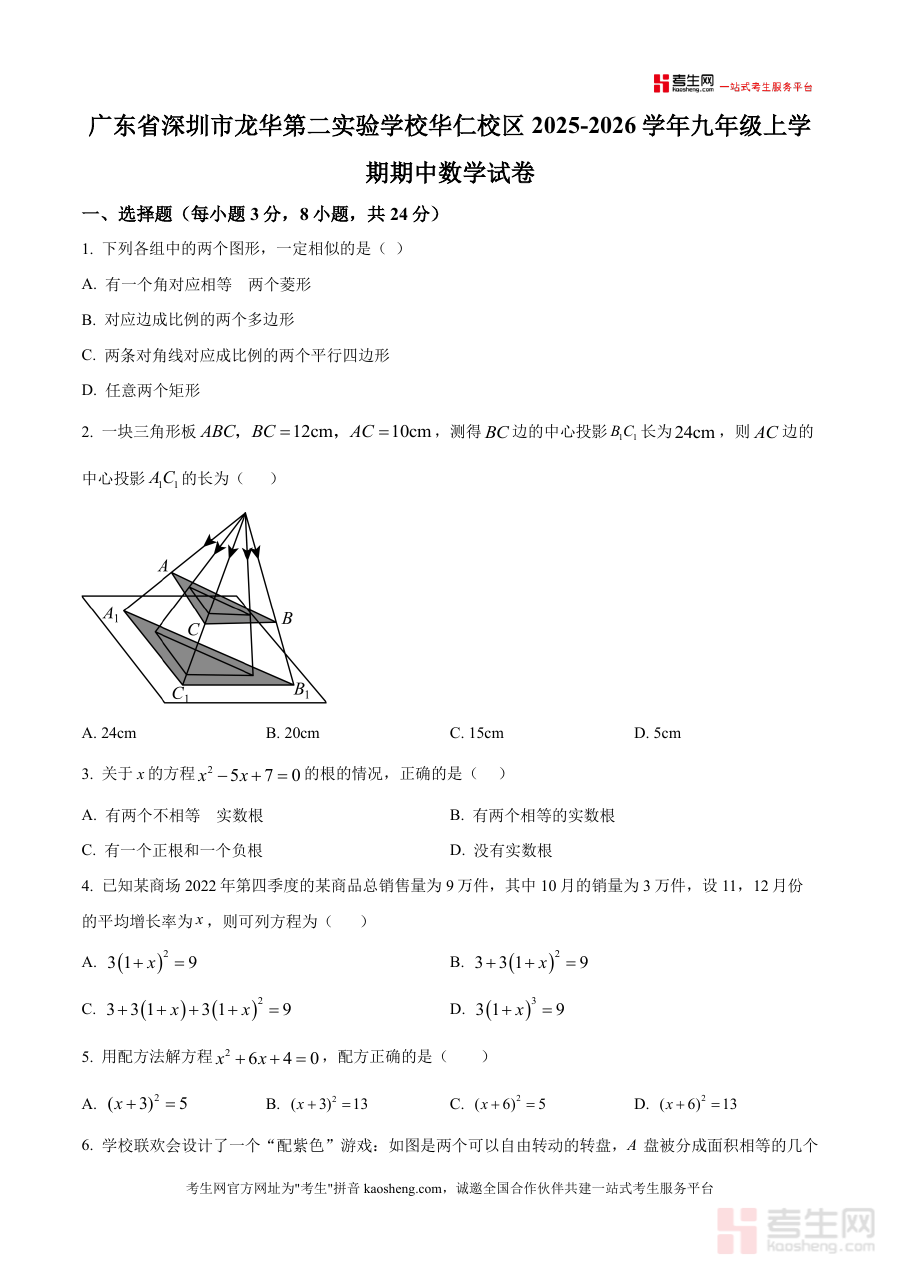 《精品解析:广东省深圳市龙华第二实验学校华仁校区2025-2026学年九年级上学期期中数学试卷(原卷版).docx》是一份针对广东省深圳市龙华第二实验学校华仁校区特定教学场景与考试需求设计的备考资料,对应该校2025-2026学年九年级上学期期中数学考试,精准匹配该年级该学期中段学习阶段的检测目标,为使用者提供了与学校教学进度高度契合的考试资料参考依据。
