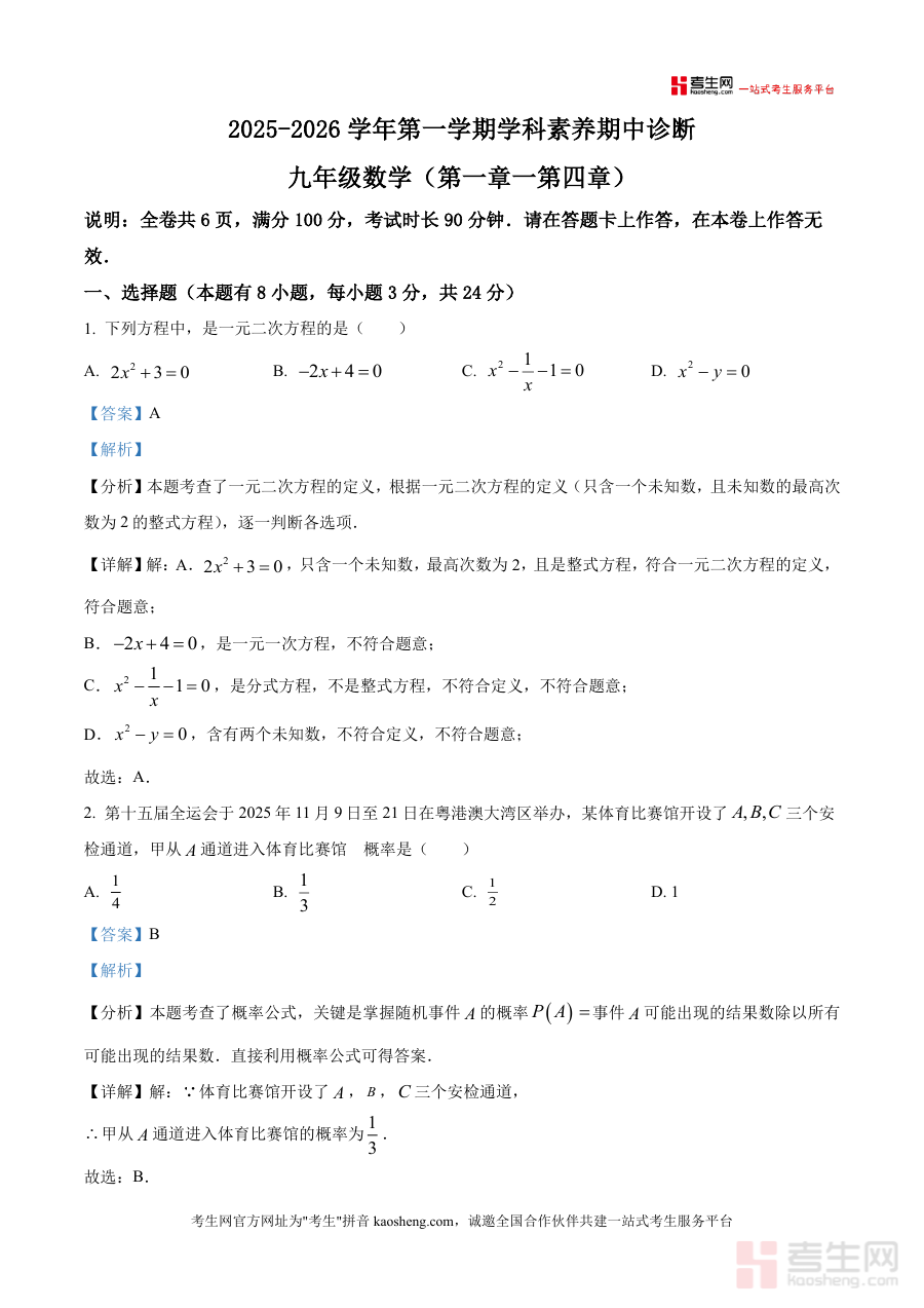 精品解析广东省深圳市龙岗区20252026学年上学。期九年级期中考试数学试卷解析版docx是一份针对特。定阶段考试的备考资料核心围绕考试的时间地区与用途展。开为考生提供阶段检测与备考参考这份资料的核心用途在。于帮助对应年级的学生明确学习重点通过阶段考试诊断学。情为后续复习规划提供依据无论是开学摸底阶段。