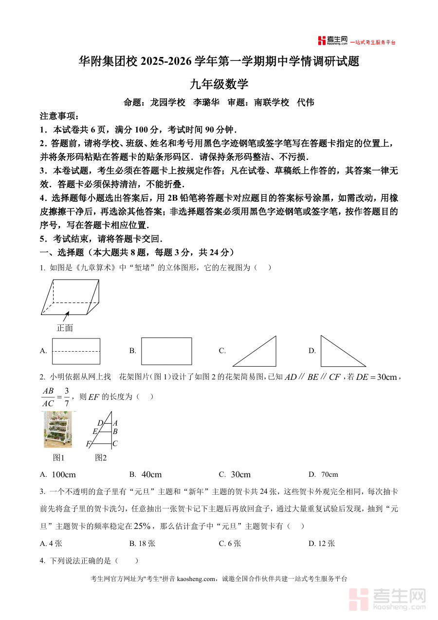 这份资料主要用于华附集团校九年级学生进行期中数学考试前的实战模拟训练,帮助学生提前熟悉考试时长、答题流程及试题呈现形式;同时也可作为教师或辅导人员开展学情诊断与备考规划工作的重要工具,辅助分析学生对阶段知识掌握情况,为后续教学与备考策略调整提供参考依据,确保使用者精准把握期中联考数学科目的考查要求与场景。