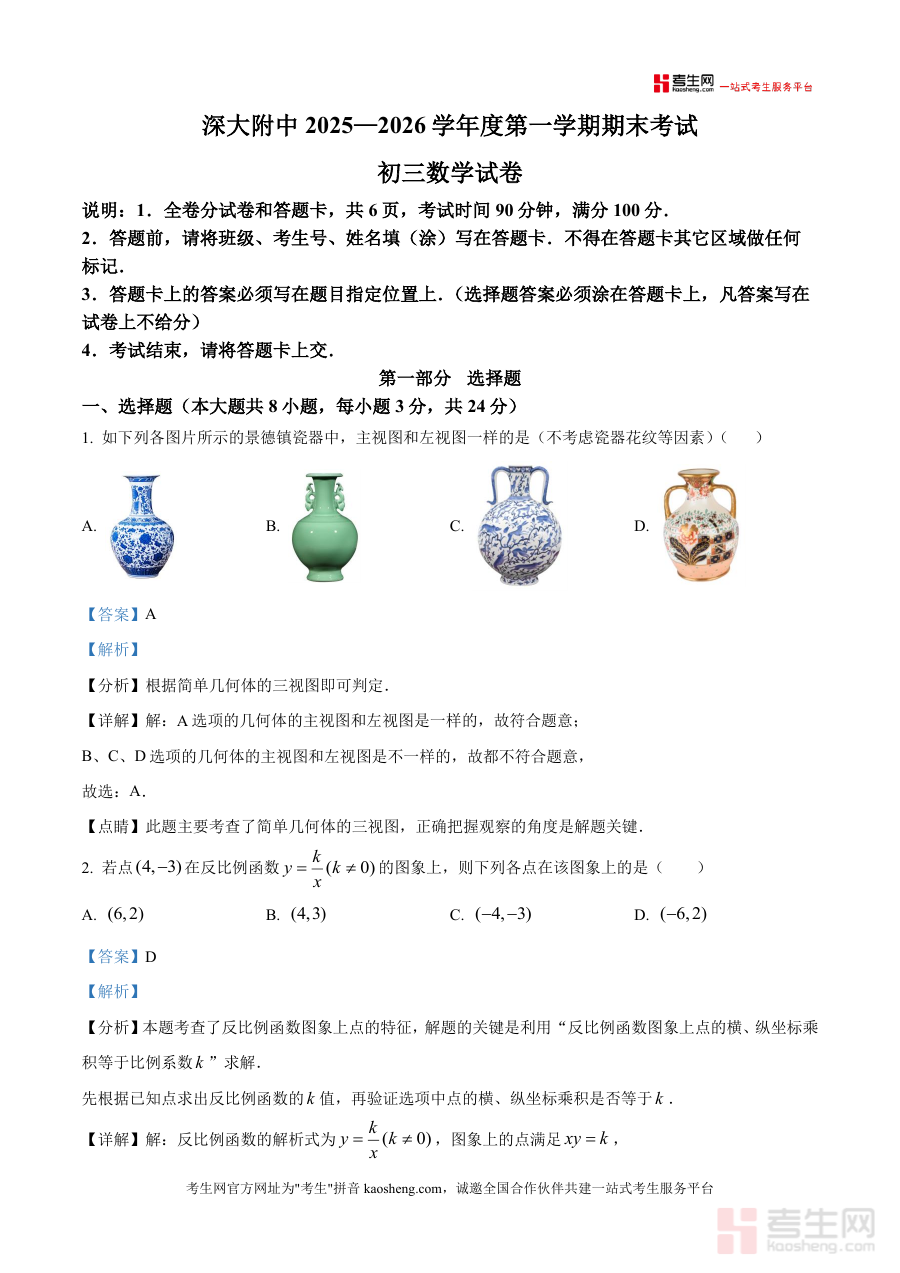 《精品解析:广东省深圳市深圳大学附属中学2025-2026学年九年级上学期1月期末数学试题(解析版)》是一份针对广东省深圳市深圳大学附属中学特定学年学期末数学考试编制的数据类备考资料。该资料对应学校2025-2026学年九年级上学期1月份举行期末数学考试,属于校内阶段性终结性评价考试类型,旨在反映学生该学期数学学习成果,其编制基于学校该次期末数学考试试题及对应解析内容。
