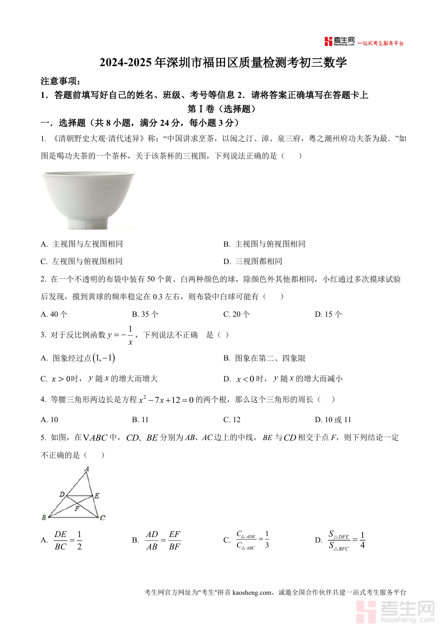 《精品解析:广东省深圳市福田区2024-2025学年九年级上学期质量检测考试数学试题(原卷版)》是一份对应广东省深圳市福田区2024-2025学年九年级上学期数学学科阶段质量检测考试的原卷资料。该资料精准匹配该地区特定学年九年级数学质量检测场景,是反映本次考试命题形式与结构框架的参考资料,能够让使用者直接接触到该次质量检测考试数学科目的原始呈现形态,为了解本地阶段考试要求提供直接依据。