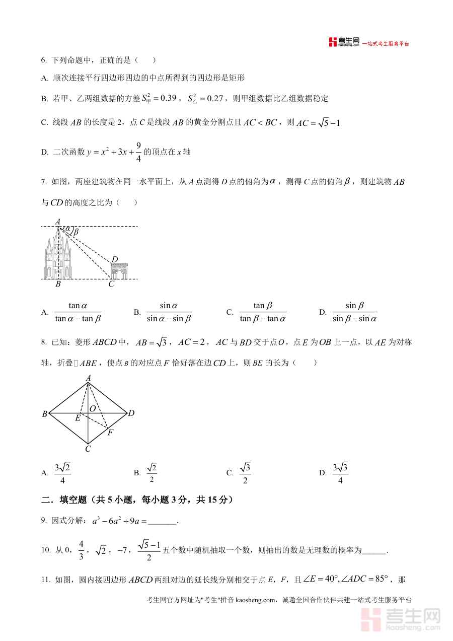 《精品解析:2025年广东省深圳市南山区南山外国语学校(集团)大冲学校中考一模数学试题(原卷版).docx》是一份针对2025年广东省深圳市南山区南山外国语学校(集团)大冲学校九年级中考一模的数学学科原卷资料。该资料对应该校2024-2025学年第二学期开展的九年级一模学科素养调研中的数学试题部分,完整呈现了此次考试数学科目的原卷内容,属于该校中考备考阶段关键资料之一,能够真实反映该次一模考试数学科目的命题框架与试卷构成情况。