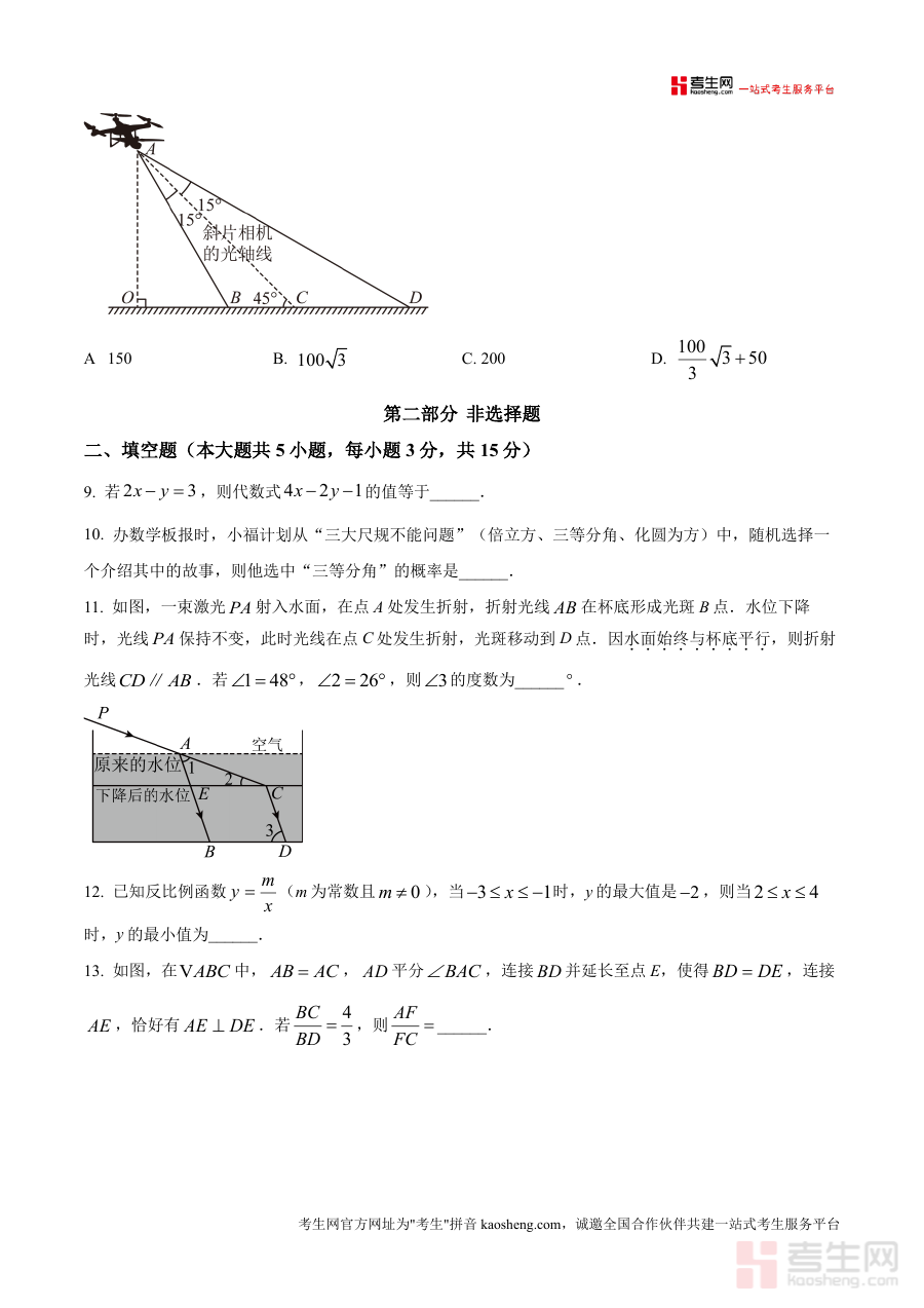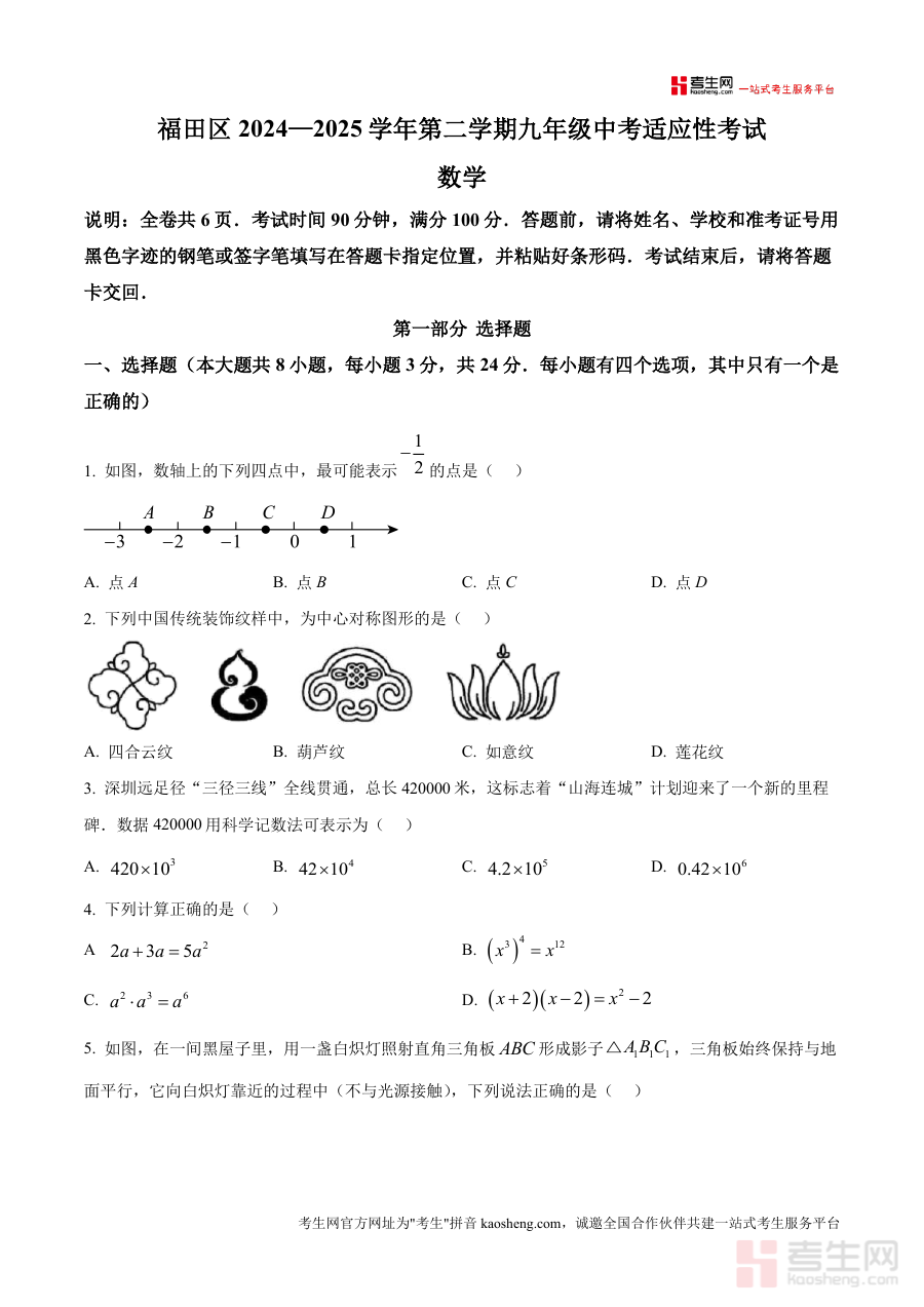 《精品解析:2025年广东省深圳市福田区中考一模数学试题(原卷版).docx》是一份针对2025年广东省深圳市福田区九年级中考适应性考试设计的数学学科原卷版备考资料。该资料对应福田区2024—2025学年第二学期中考前阶段性检测,能够为考生提供与本地中考一模考试完全一致的试卷呈现形式。作为区域内重要的中考备考参考资料,它严格遵循当地中考数学考试规范和命题方向相关元信息设计,确保资料与实际考试要求高度契合,不涉及具体知识点或题型难度的额外解读,仅还原考试的基本框架和形式特征。